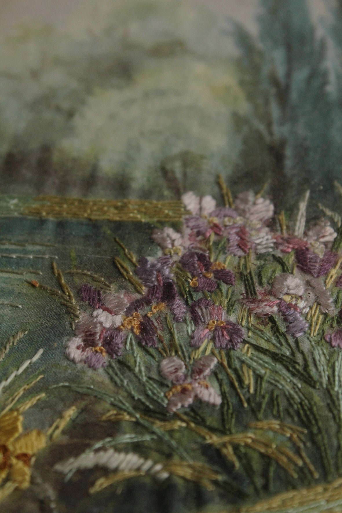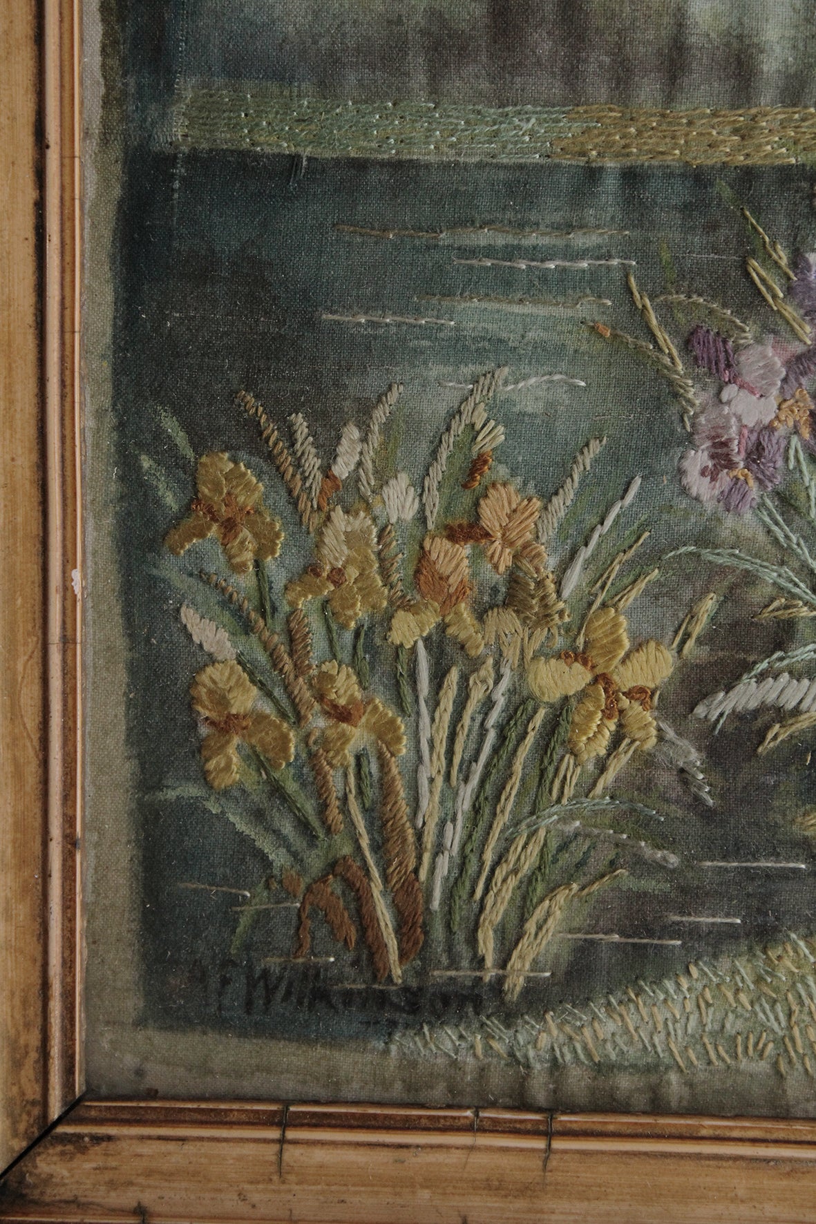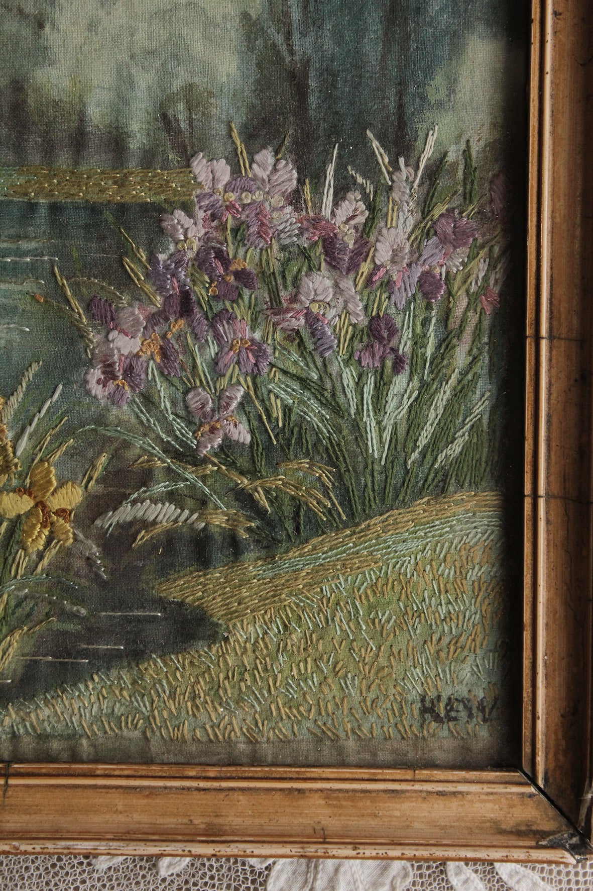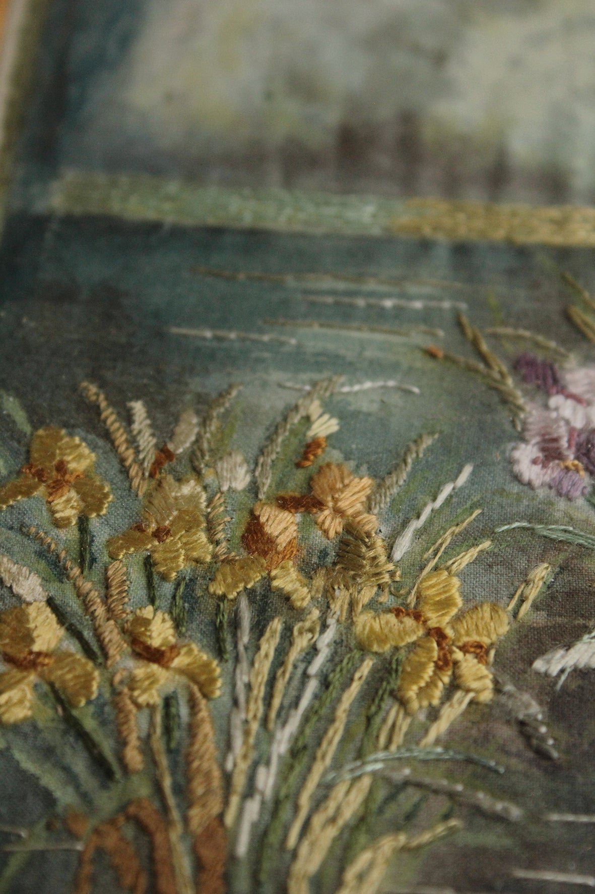 An exquisite hand embroidered and hand painted study of a view at Kew Gardens. The landscape has been painted with trees and the smallest of birds in the sky. The foreground has been hand painted too but hand embroidery sits on the top of this with details of Flag Iris exquisitely embroidered.