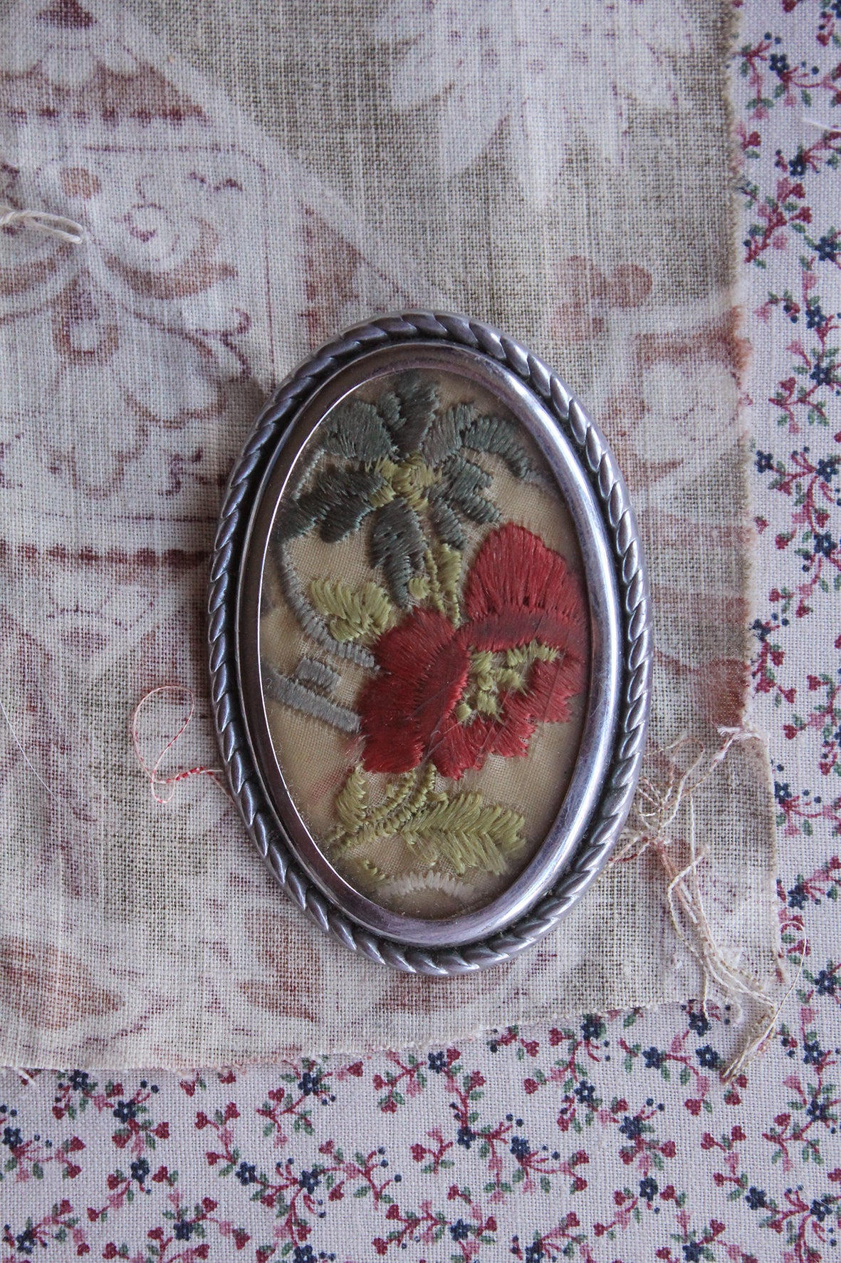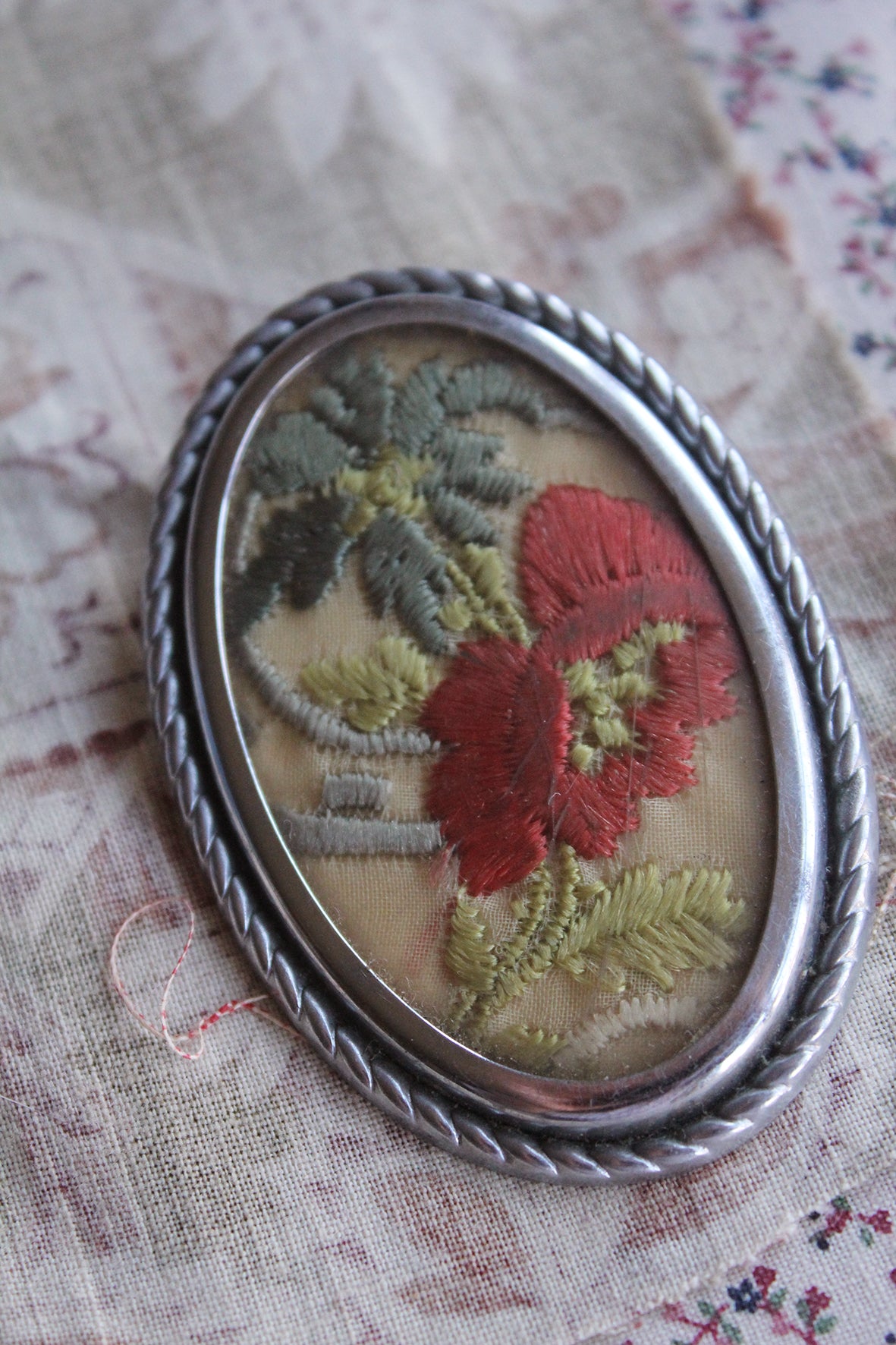 An old thirties hand embroidered brooch detailing beautiful flowerheads and foliage.