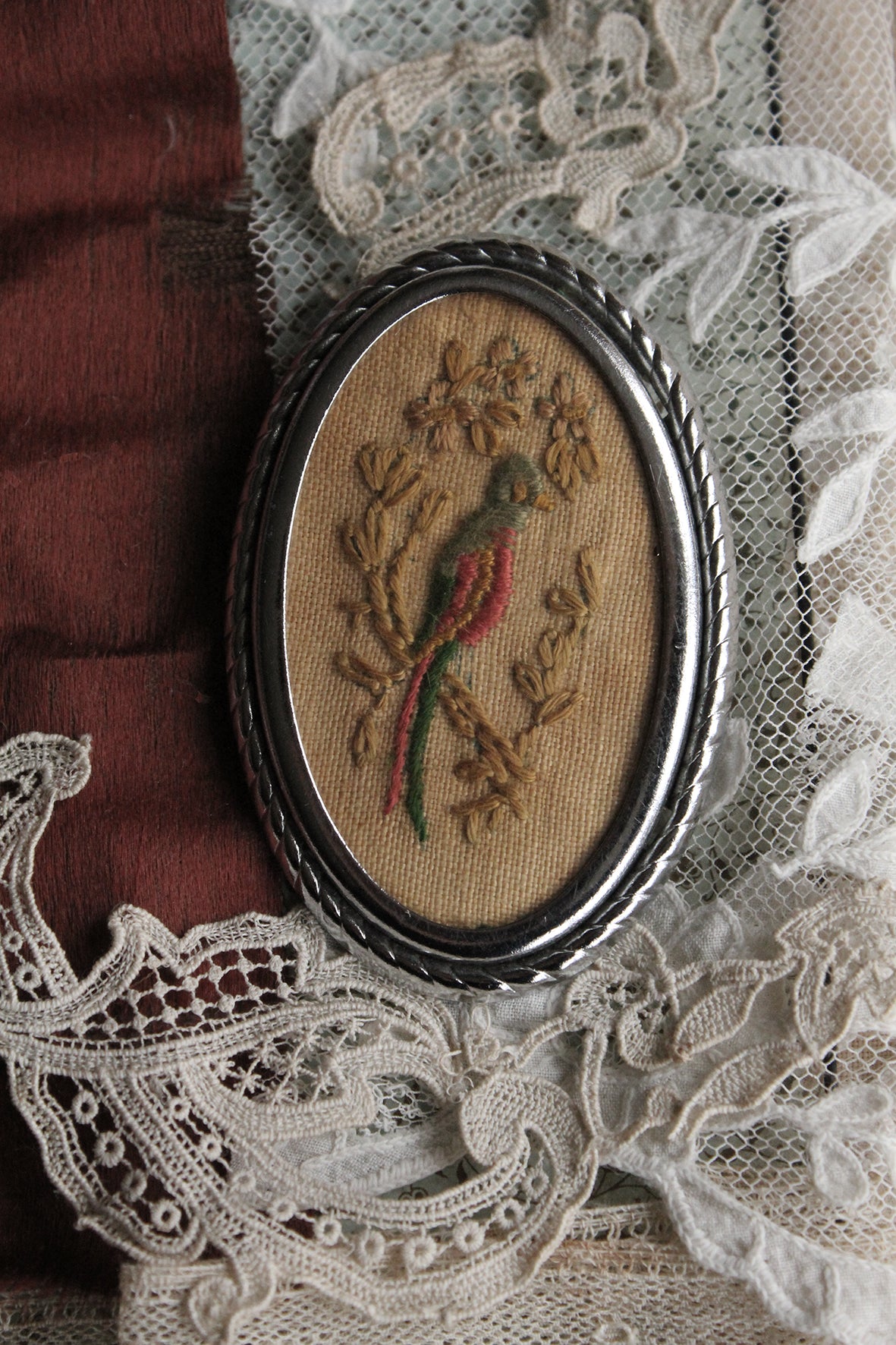 An old twenties hand embroidered brooch detailing a sweet parakeet