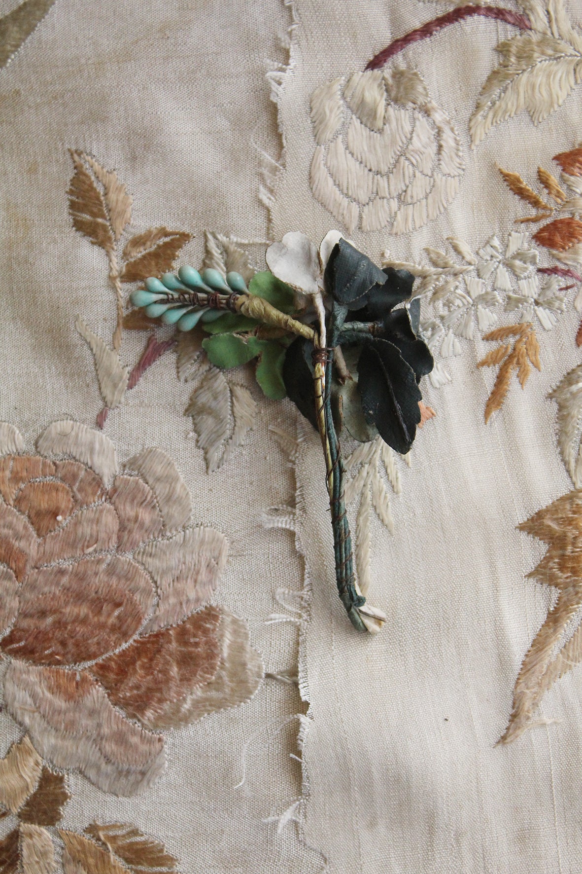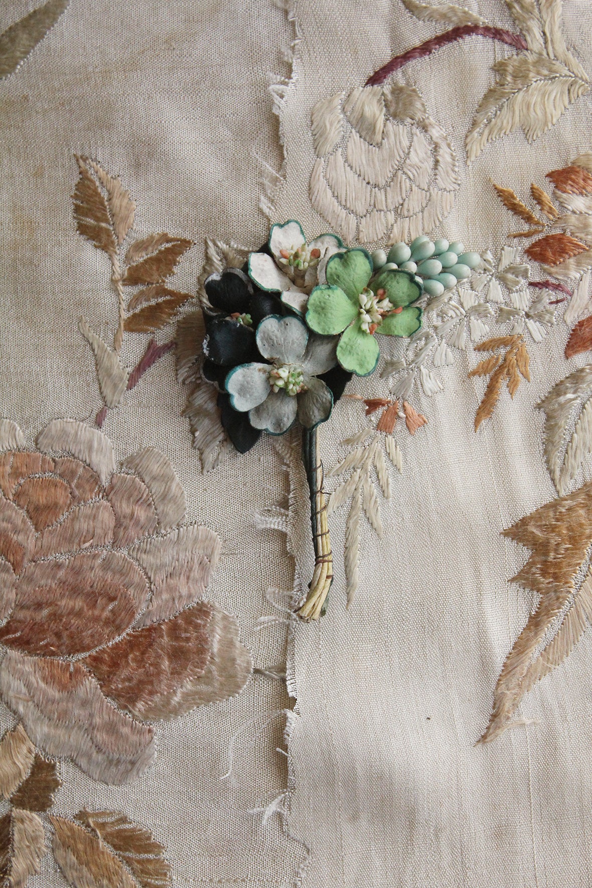 A very very beautiful hand made corsage. Wired flowers taped together to form this pretty arrangement made from painted papers. Gorgeous stamen detailing too.
