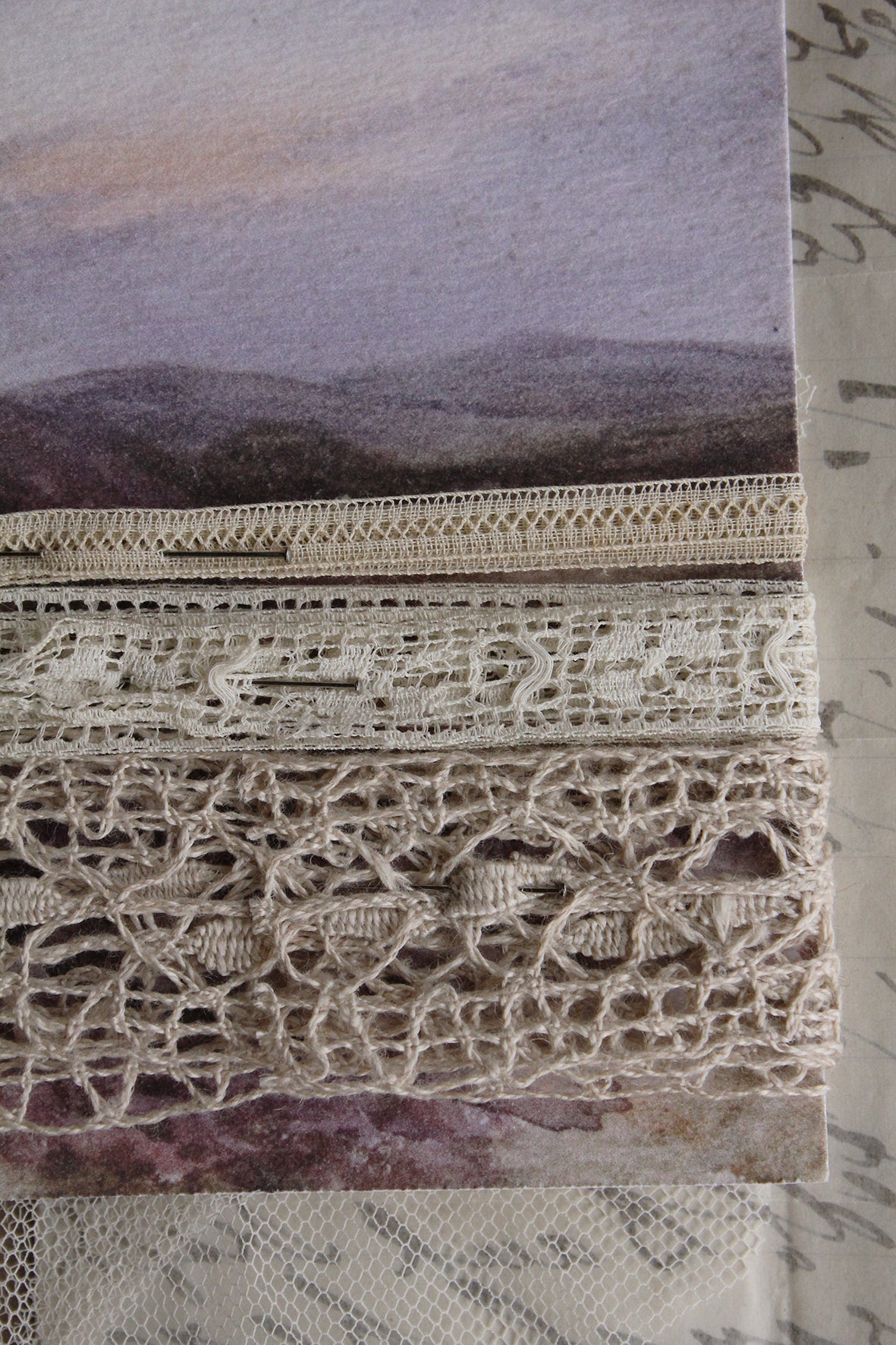 A sweet little card that has been printed with a landscape on watercolour paper from a painting here in the studio, it has then been wrapped with a small selection of antique lace to give the feel of the textures of the horizon.