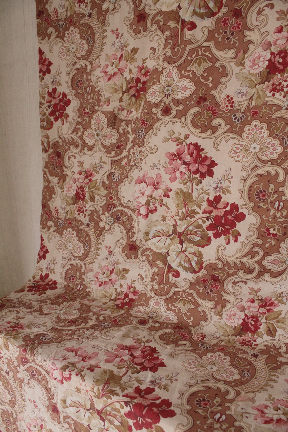 A very beautiful antique cotton panel screen printed in tones of faded terracotta, pale cream, pins and soft mustard and sage greens. Reclaimed from an old eiderdown.