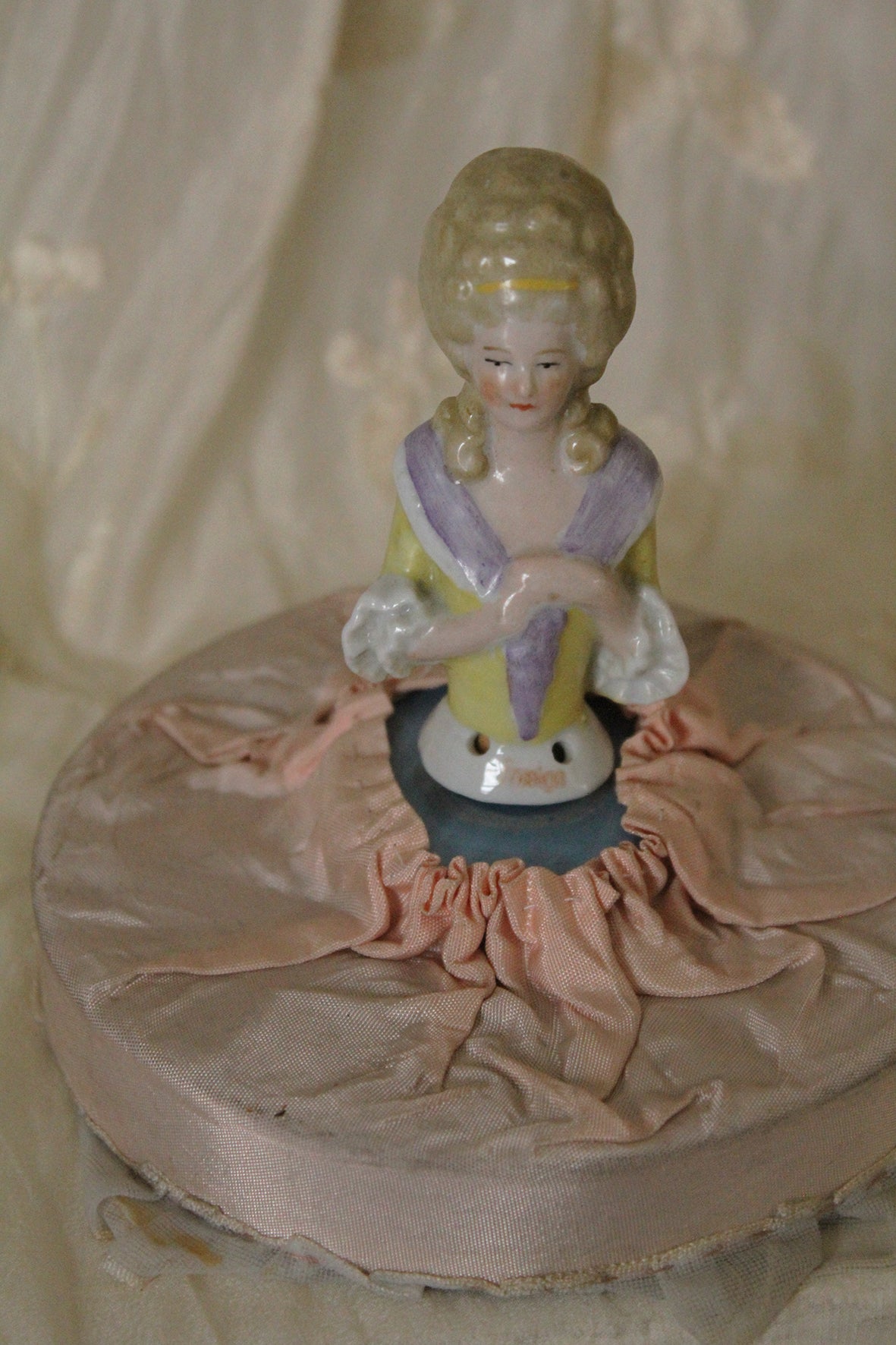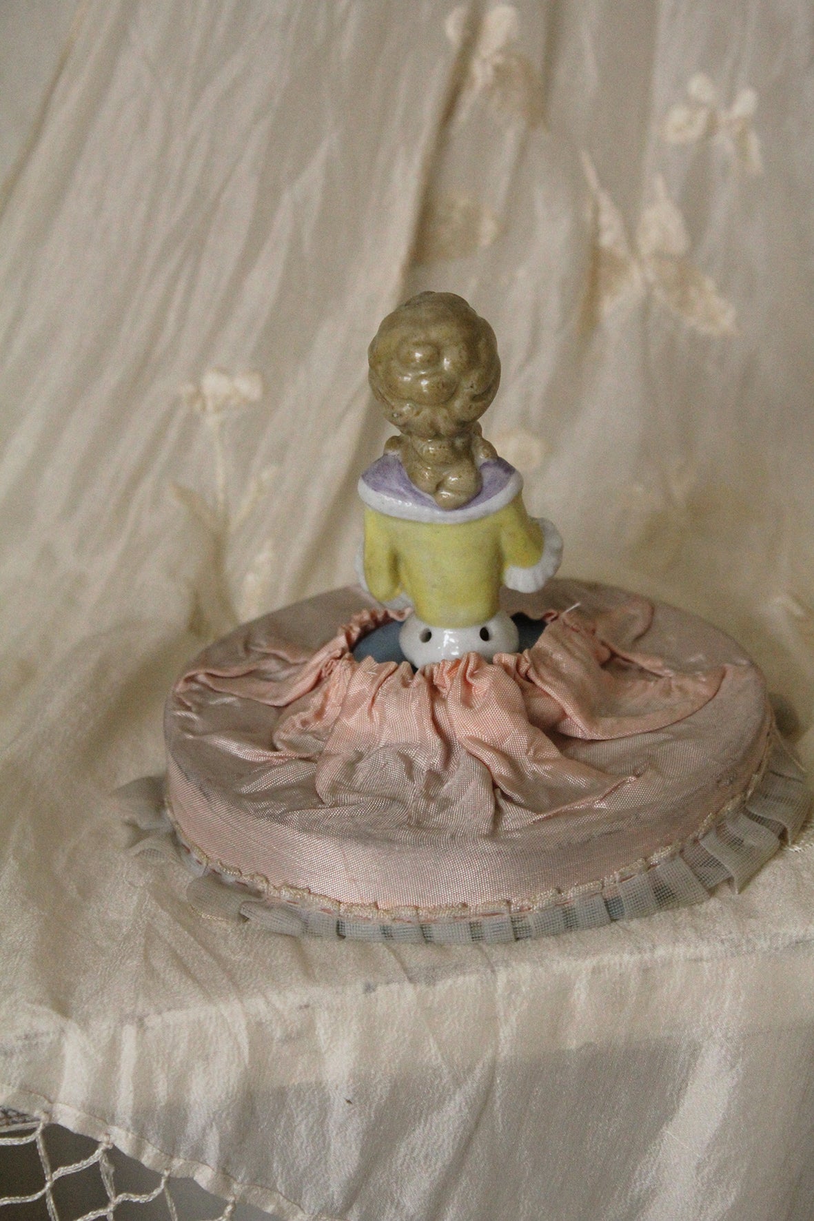 This is a larger antique version of the pin dolls. This is attached to an early plastic topper that is covered with silk crinoline style skirt. The doll will unscrew from the lid and the skirt would look lovely attached to the base of the doll.