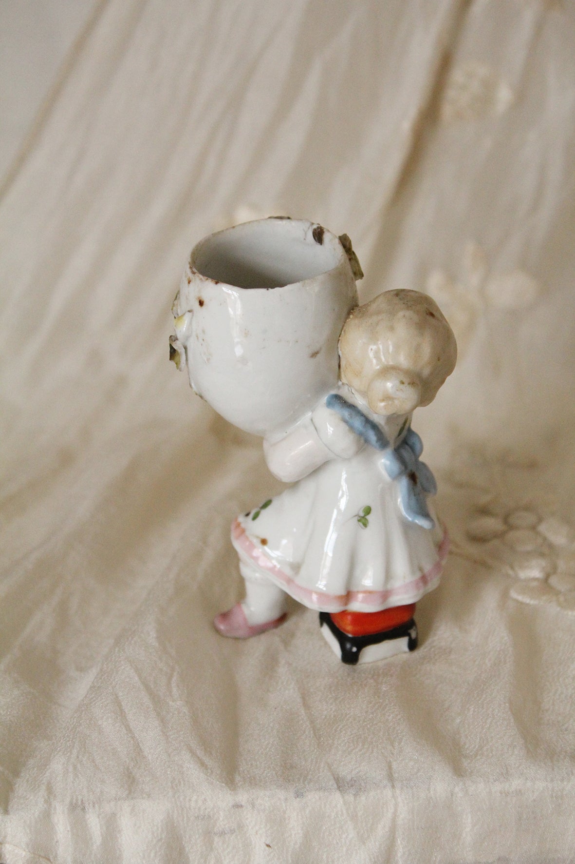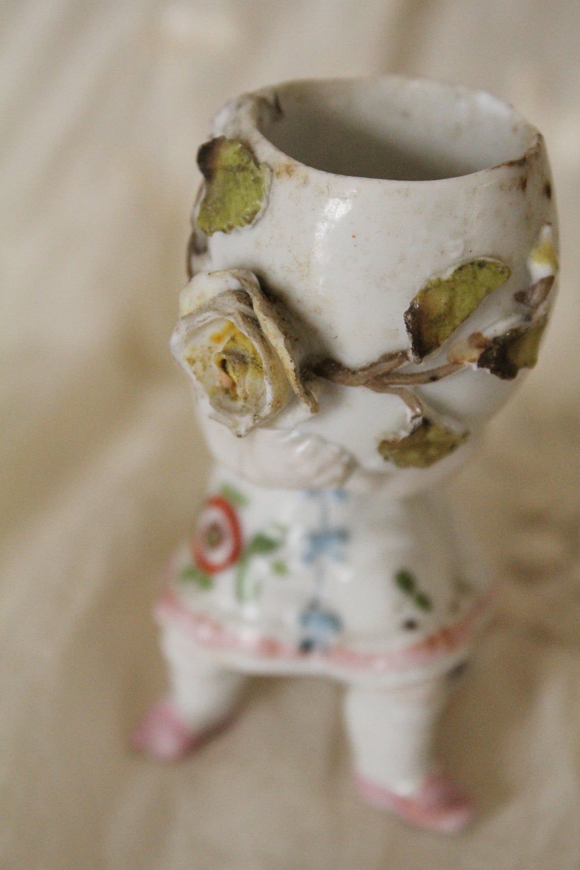 Such a sweet Victorian hand painted ornament of a child in a sweet floral dress carrying what seems to be a bowl decorated with formed roses and leaves. The girl is seated. This may have been an ornate egg cup holder...possibly.