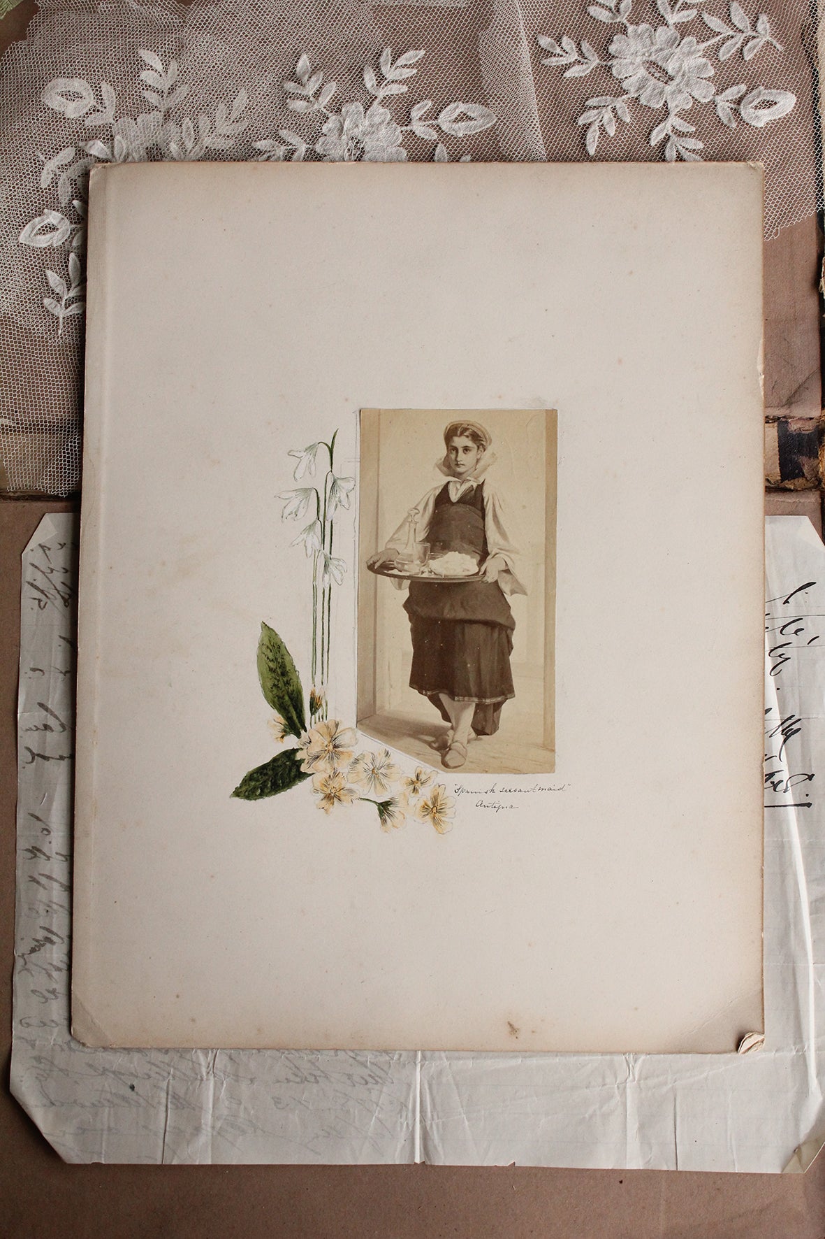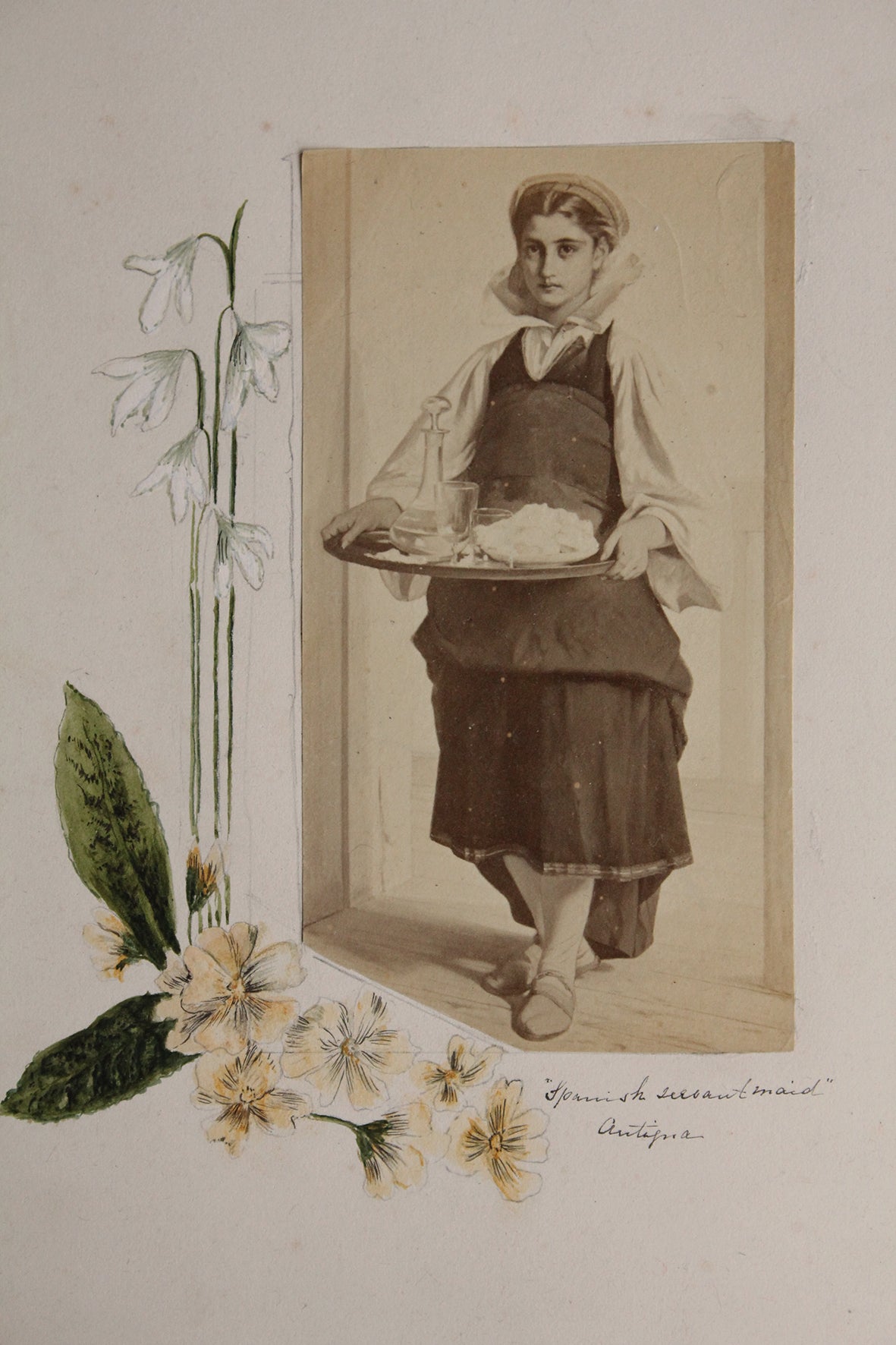 A beautiful combination of an old Victorian photograph of a drawn illustration of a maid and painted sketches of snowdrops and primrose all placed together to form an exquisite composition. Hand written in fine pen "Spanish house maid".