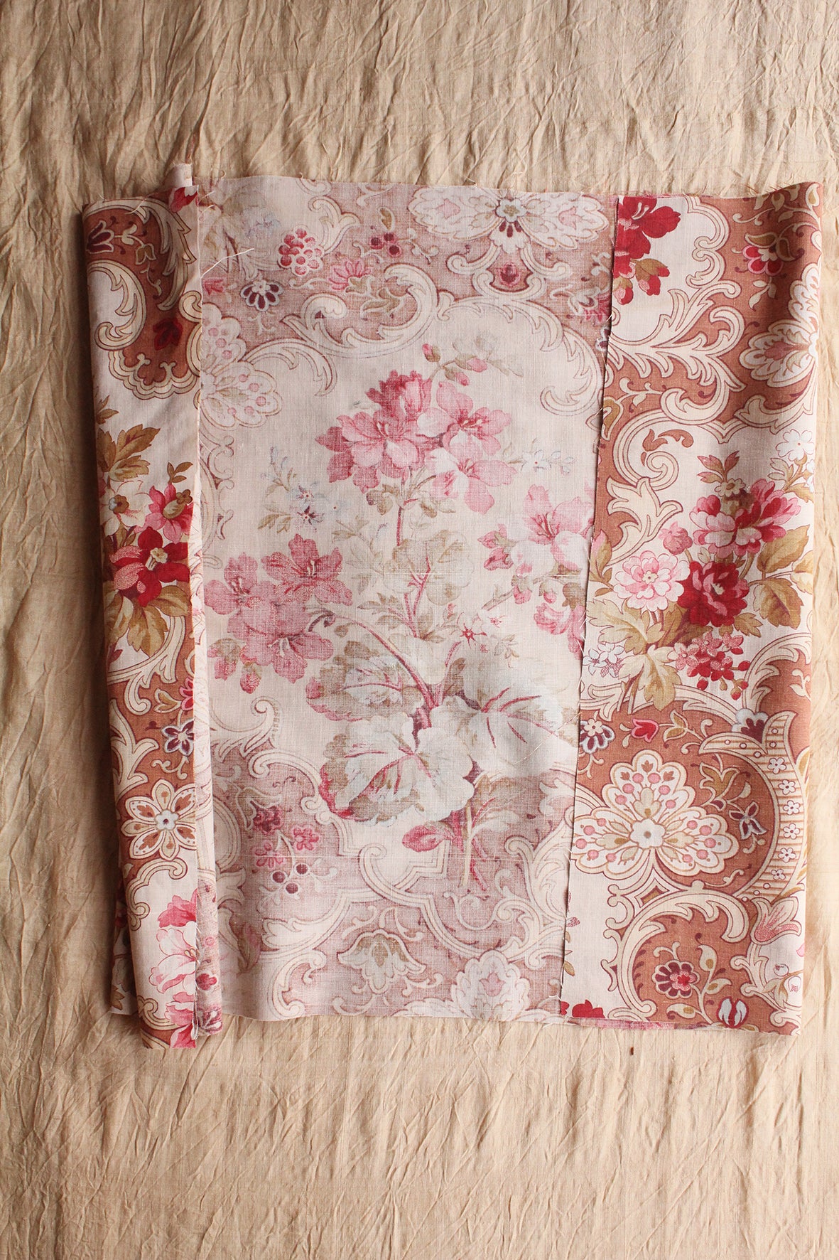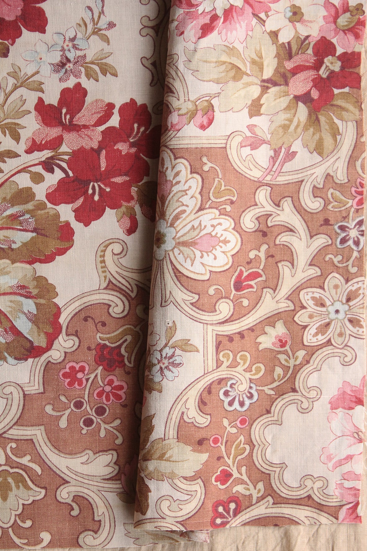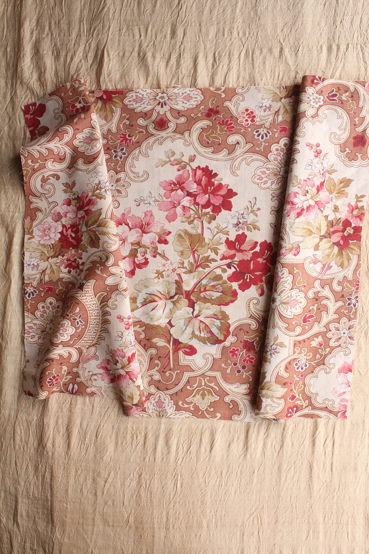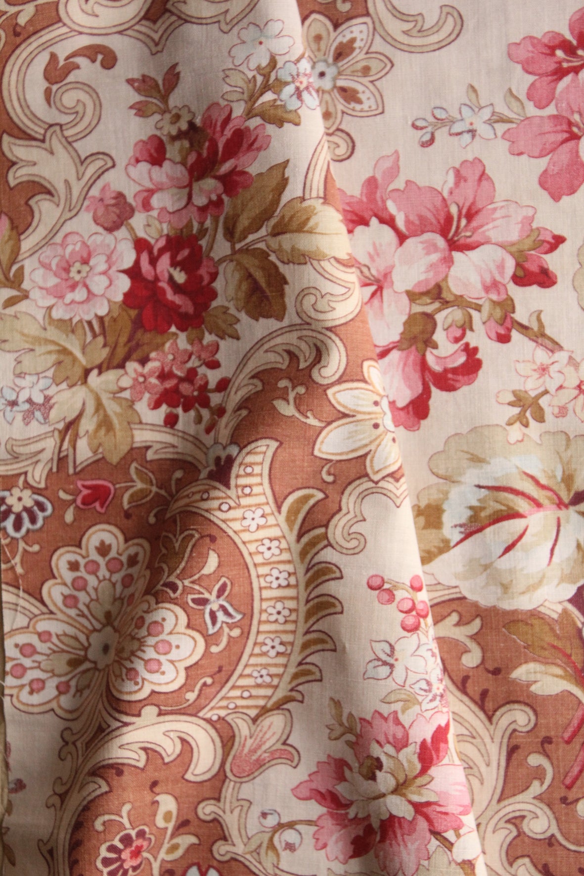 A very beautiful antique cotton panel screen printed in tones of faded terracotta, pale cream, pins and soft mustard and sage greens. Reclaimed from an old eiderdown.