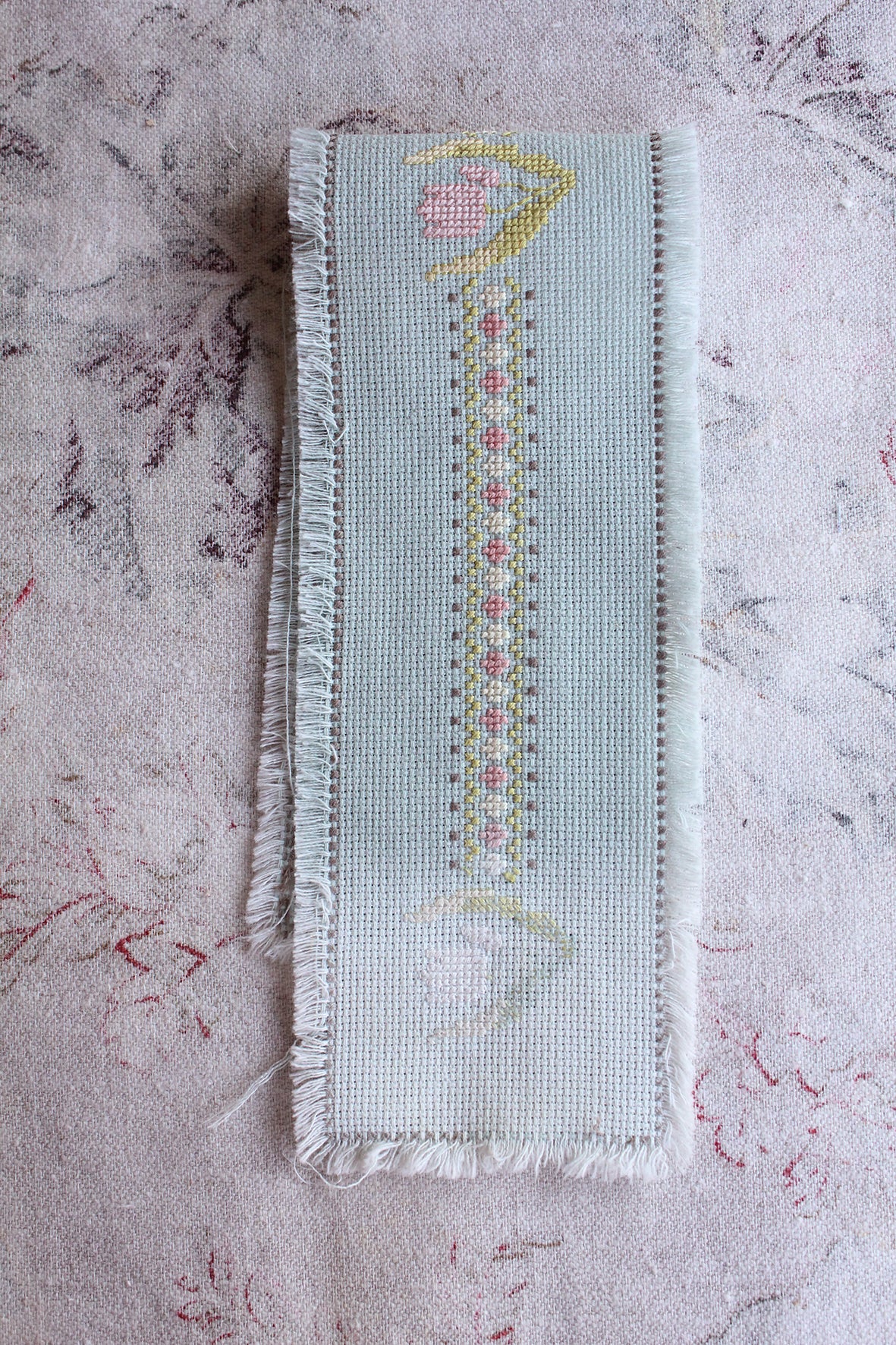 A sweet narrow needlepoint mat with an ombre blue base and decorated with a ribbon design and tulips.