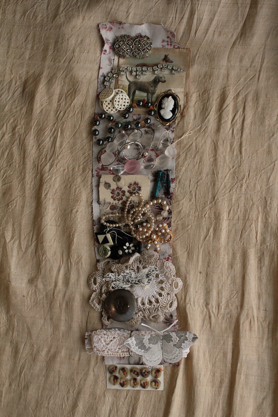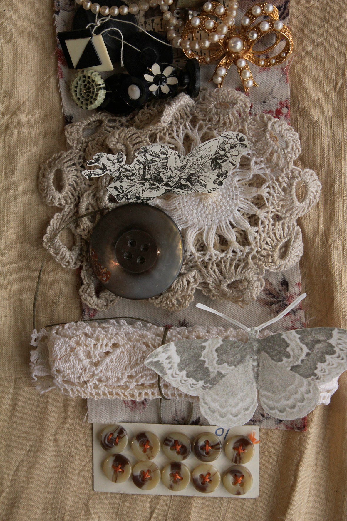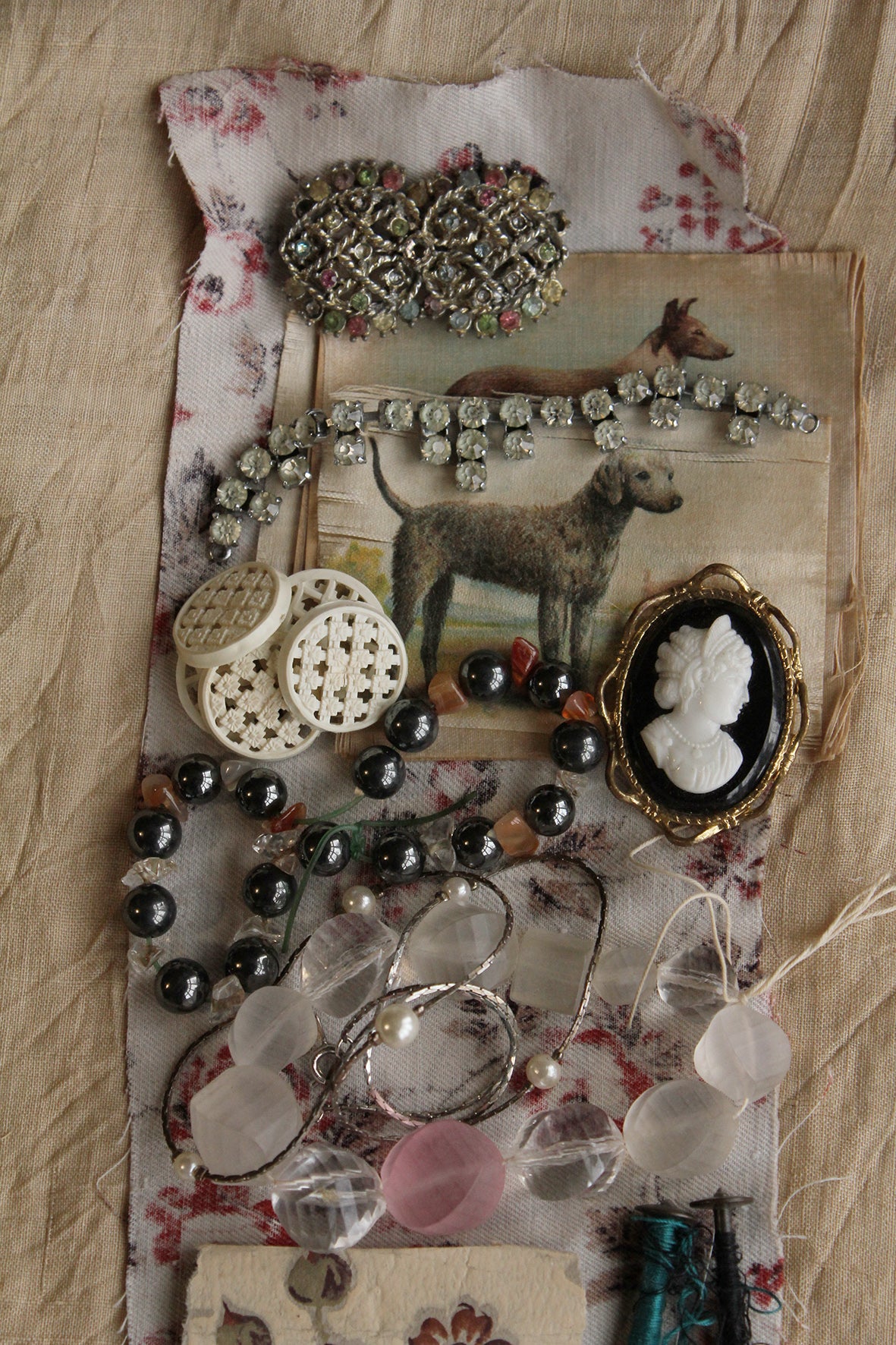 There's reclaimed jewellery fragments, glass beads, old wallpaper, lace, French fabric, bobbins, brooches and more. All with an age.