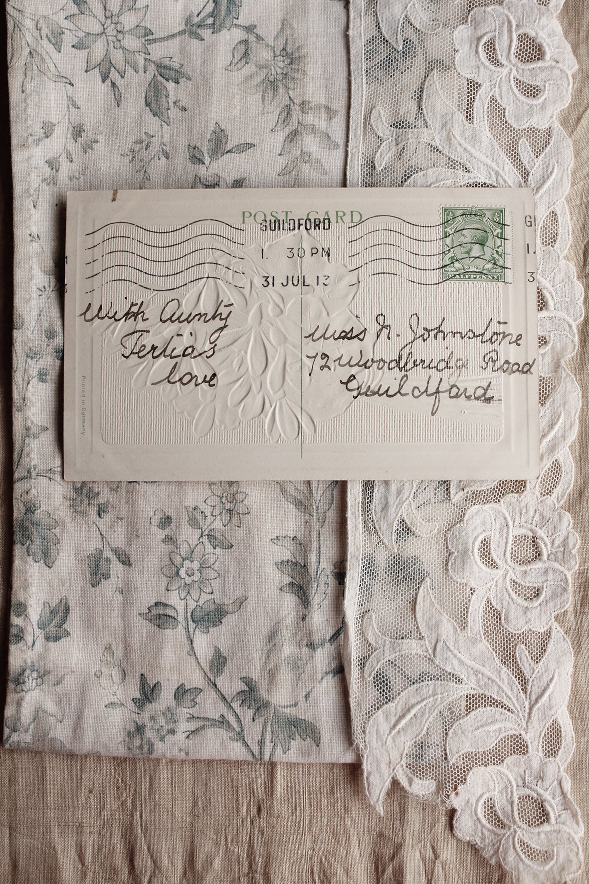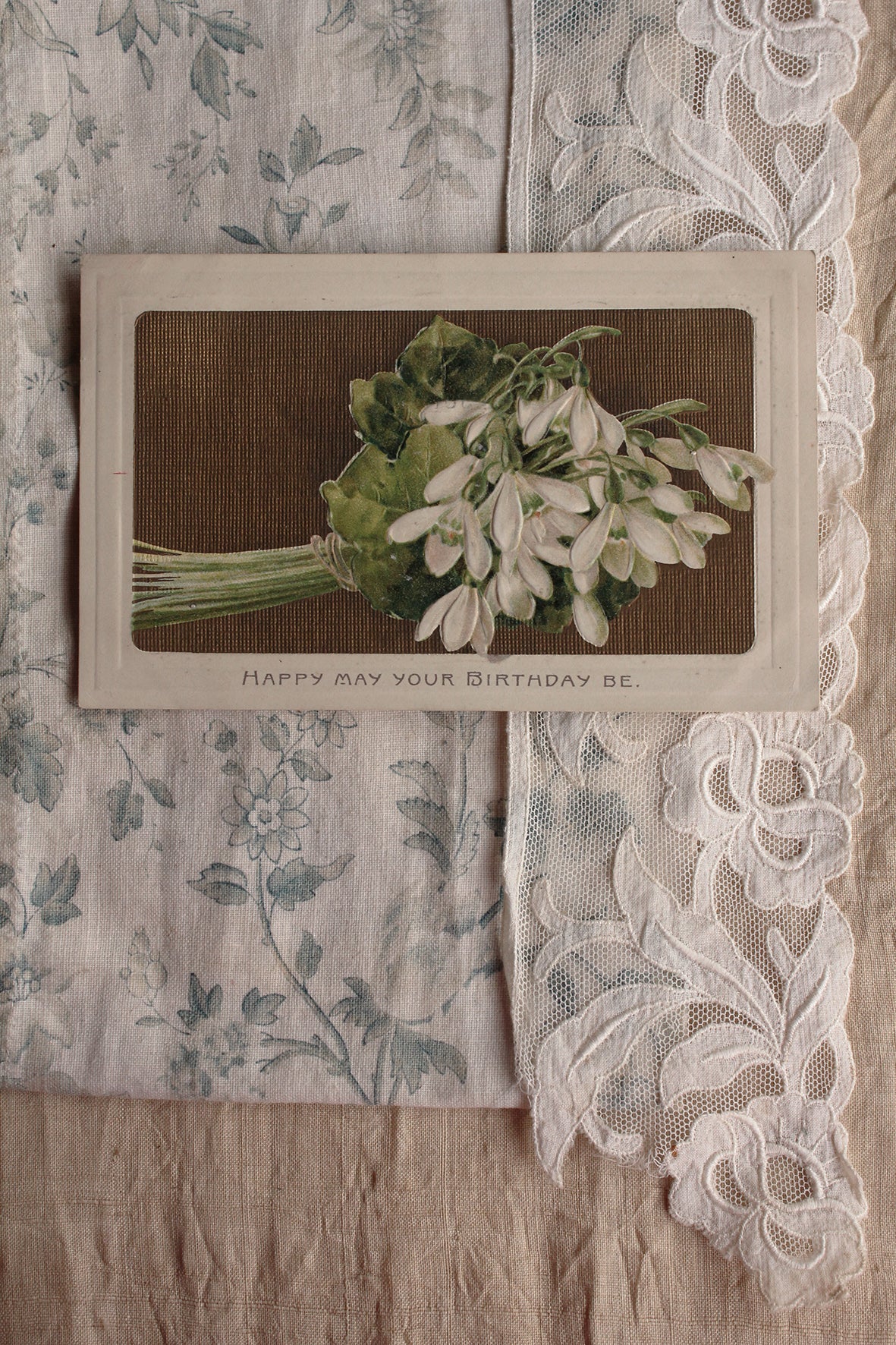 A cluster of embossed forget me nots on a dulled gold ground. It is becoming harder to find lovely old snowdrop cards so this is a treat.