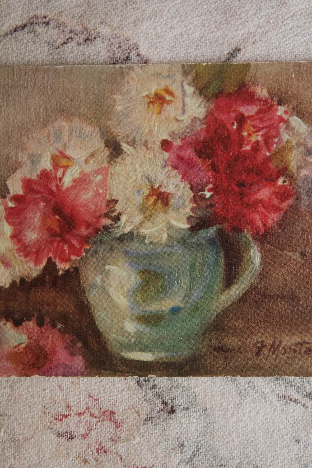 Hand written on the reverse. No stamp, dates approx 1905. This card has an embossed texture to imitate an oil painting.