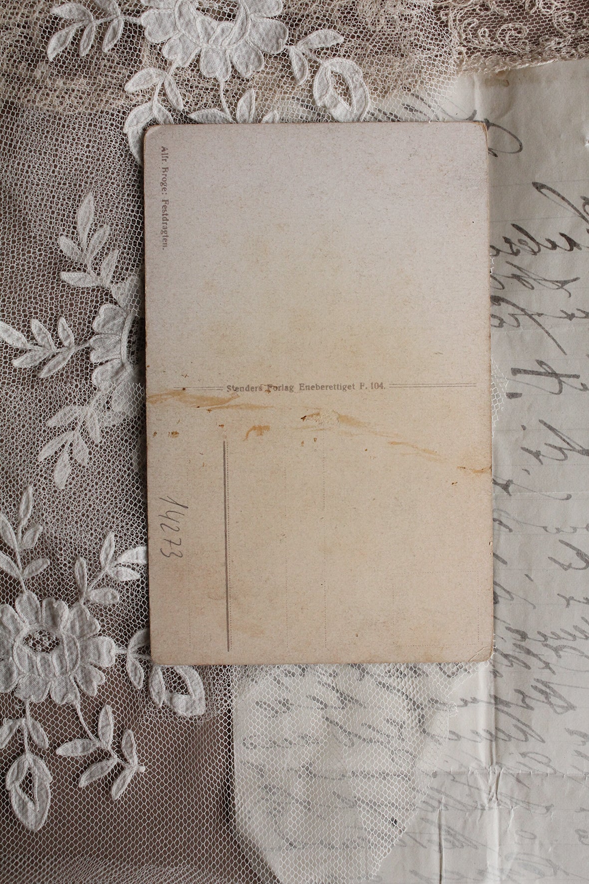A detailed collectable postcard detailing a lady dressed in an embroidered scarf and head scarves sat at a table with a pretty bunch of tulips.