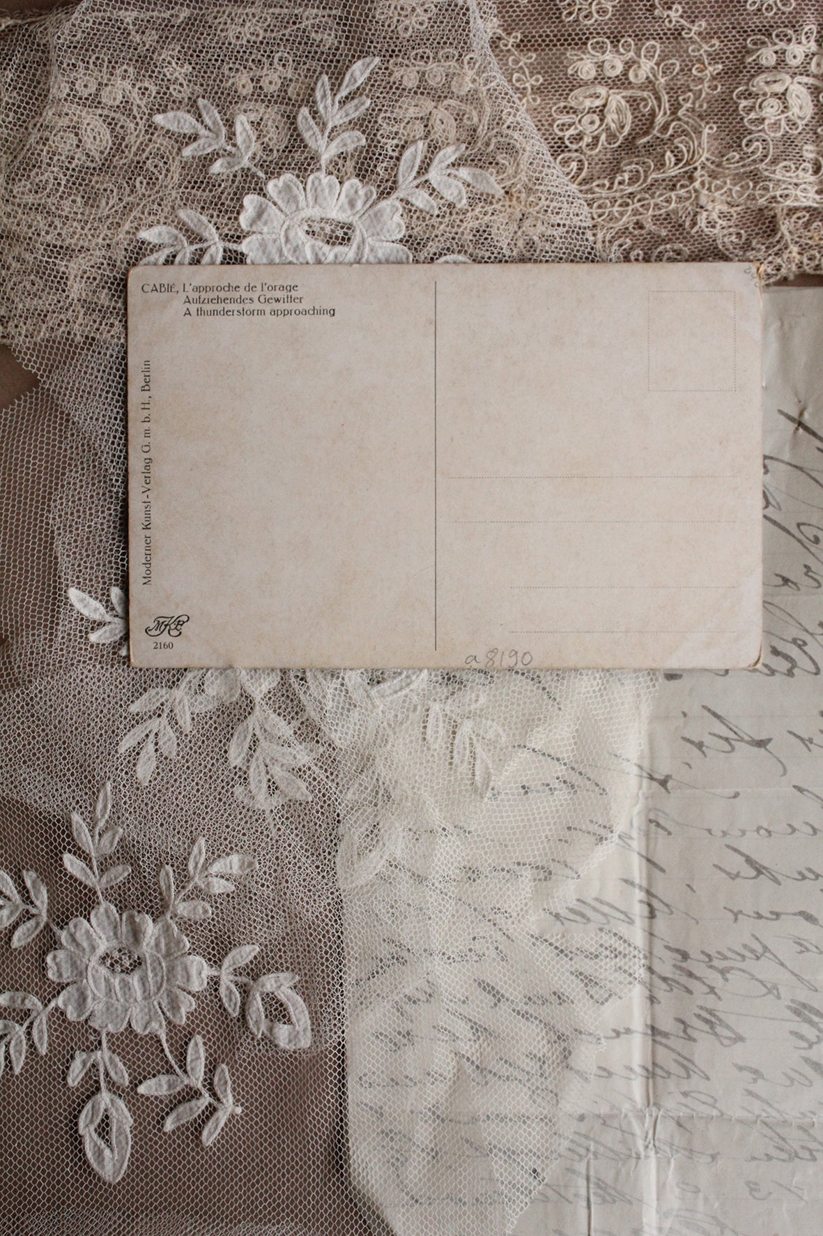 A detailed collectable postcard detailing a thunderstorm in the distance soon to arrive.