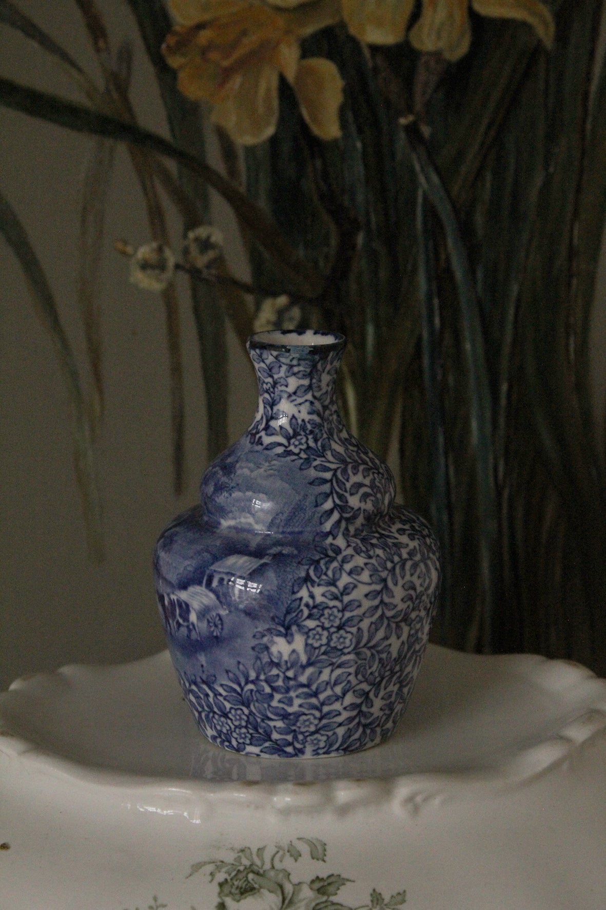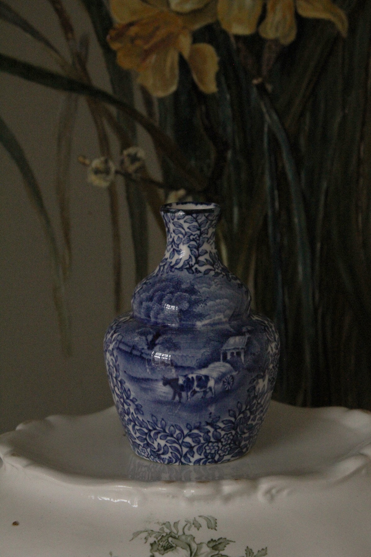 A lovely antique Fenton posy vase.  Decorated with a landscape and cattle detailing and surrounding leafy foliage.