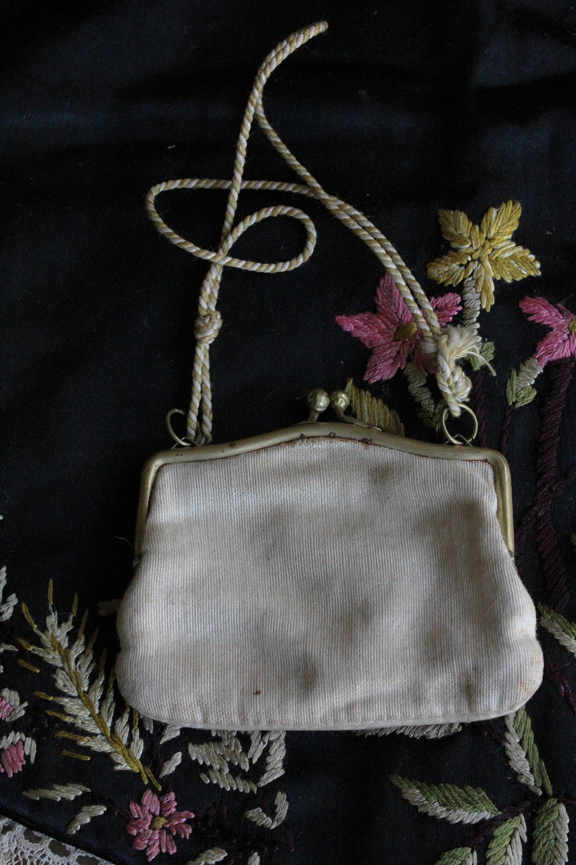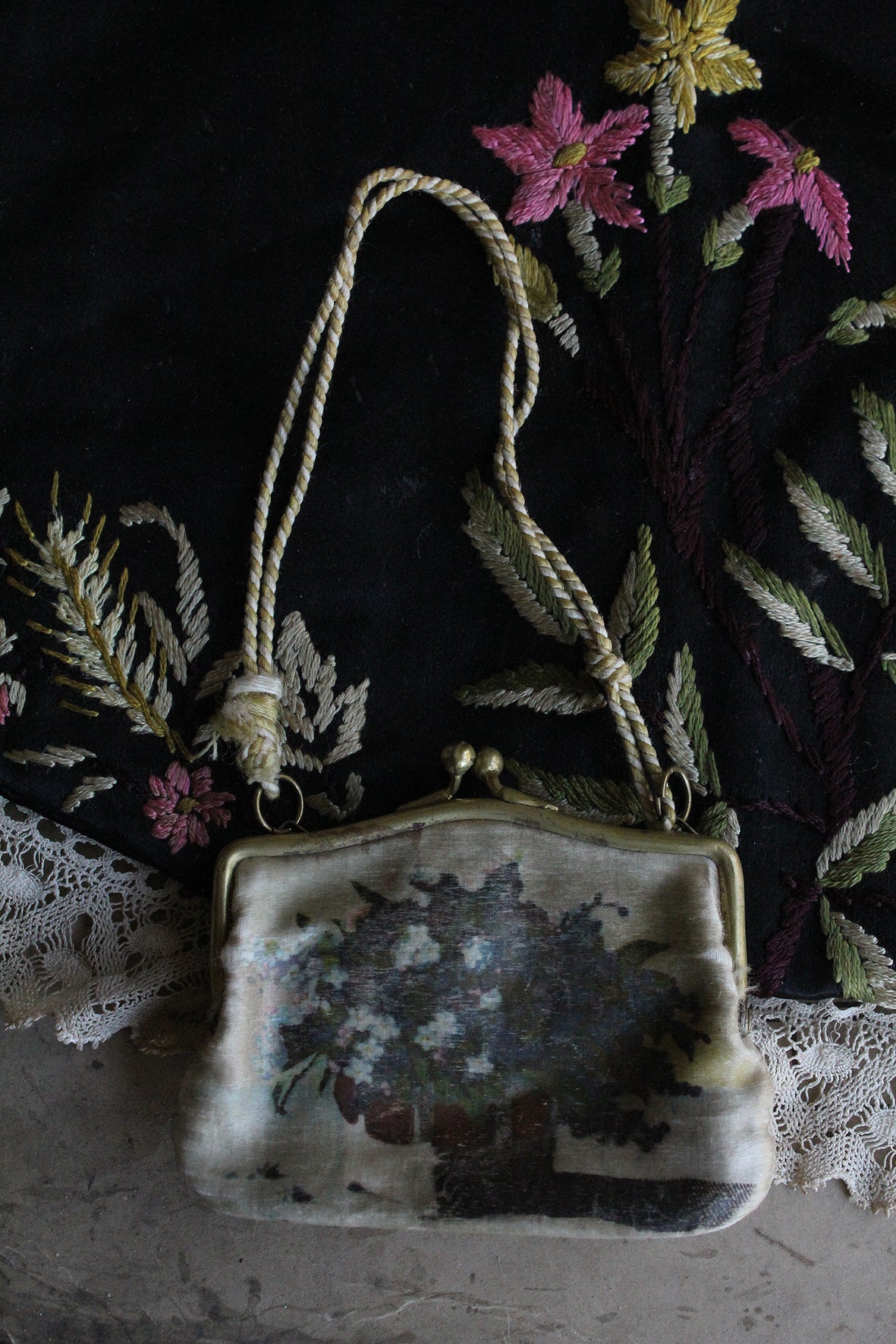 A gorgeous old silk purse that has a faded vase of flowers on one side. The handle is made from a silk cord. The handle appears to be brass.