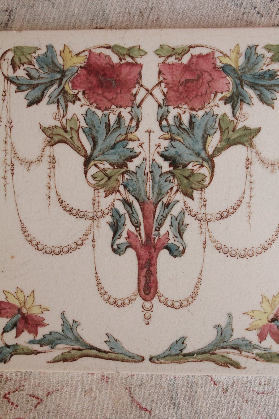 A beautiful old Victorian tile that has a lovely Arts and Crafts feel and style. A chandelier floral that has a transfer base and then hand painted.