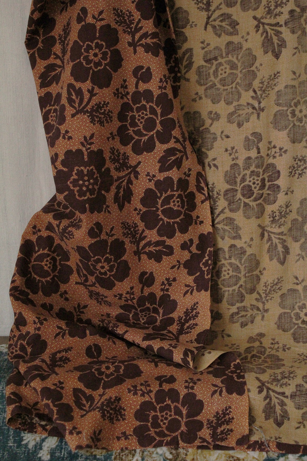 A large panel of old French fabric. The base is a tiny print, as if an enlarged open weave of a lace has been sketched and made into a teeny print. This has then been screen printed over the top with bold dark red brown flowerheads.