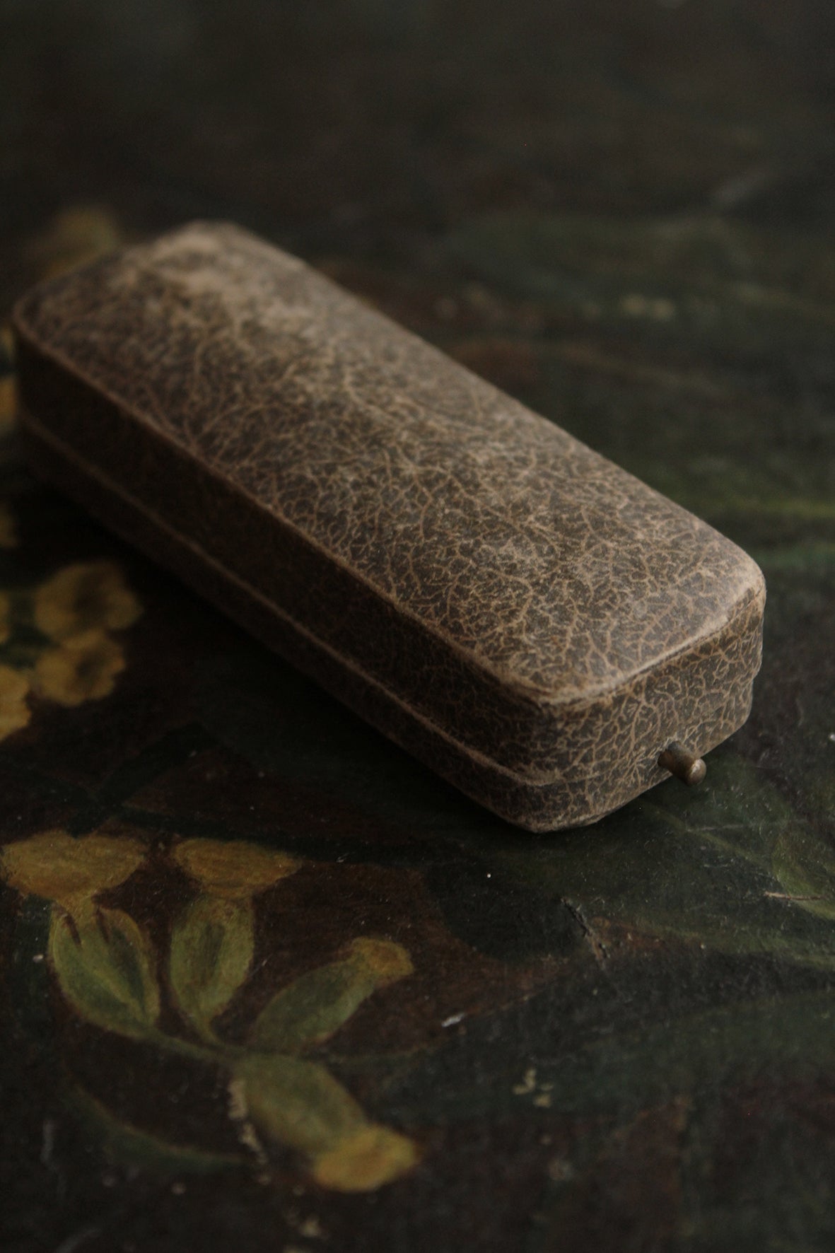 A very lovely silk lined hat pin box. Based on how well made the box is, although now very worn, it would have homed something very precious. The original push button clasp mechanism to open and lock the box is still working.