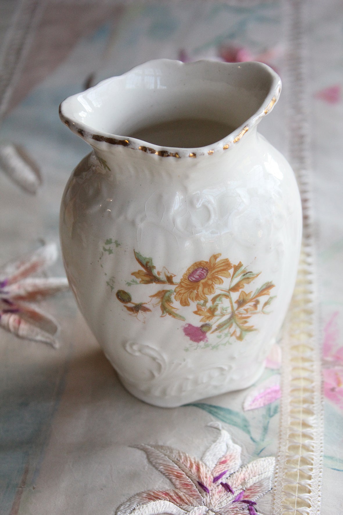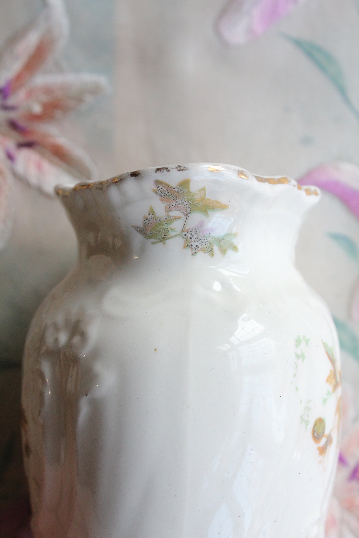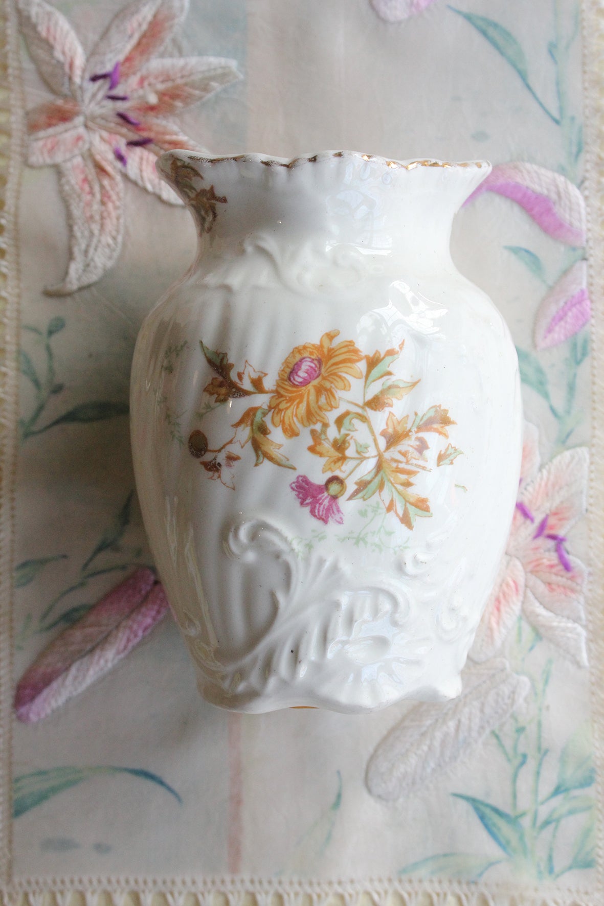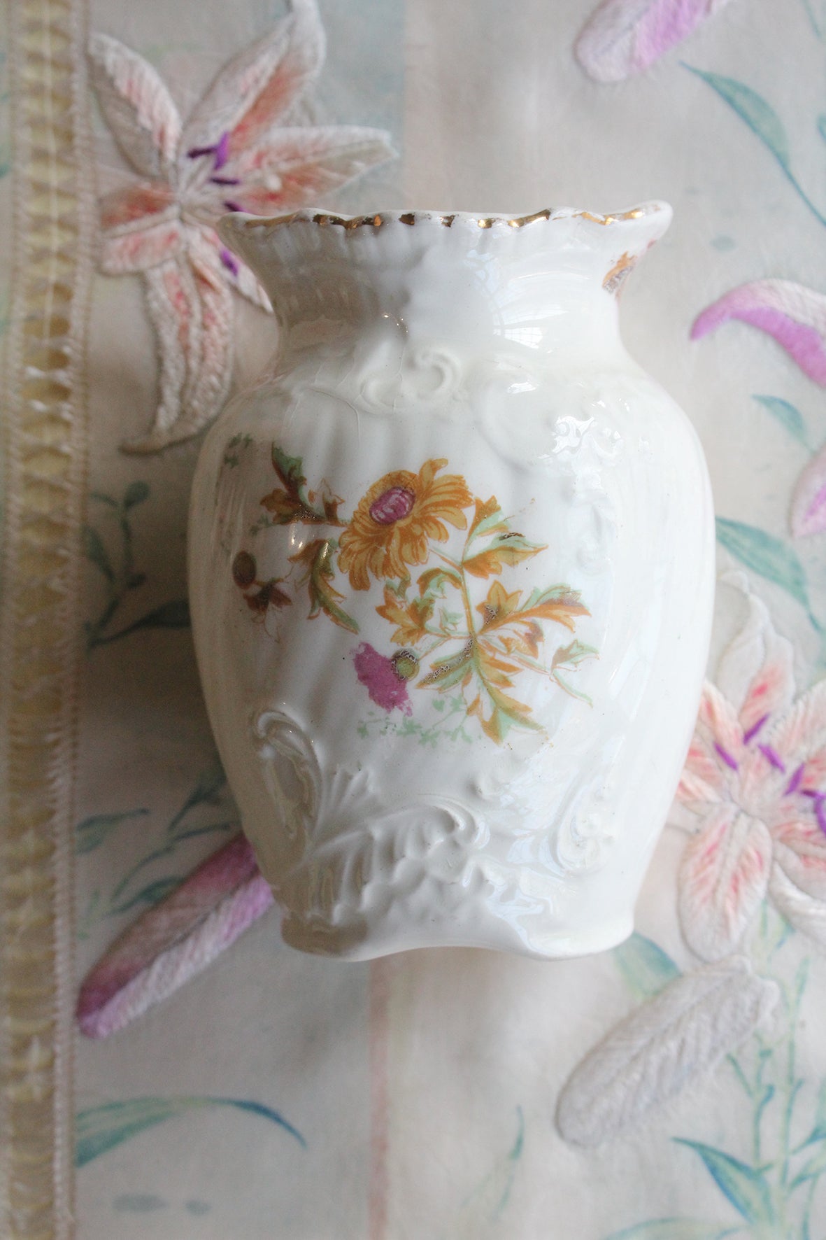 A very pretty Victorian posy vase with a detailed floral transfer and raised filigree detailing.