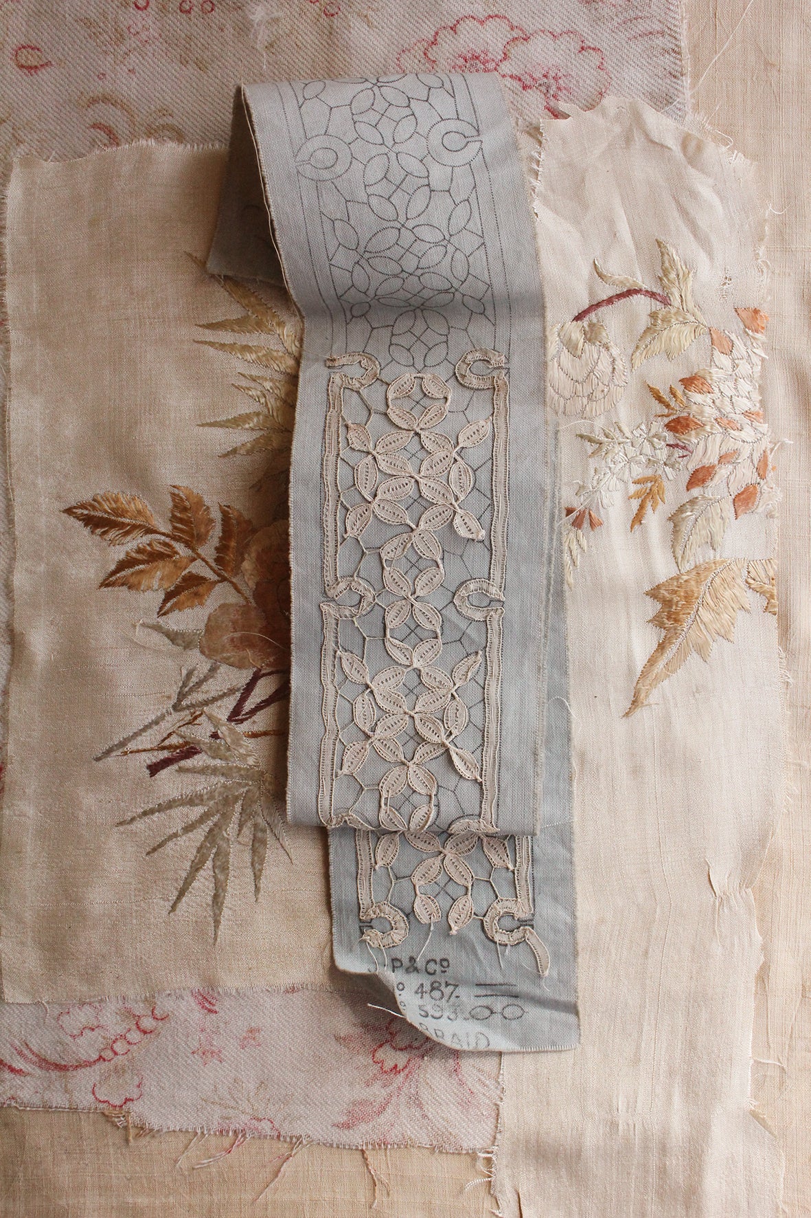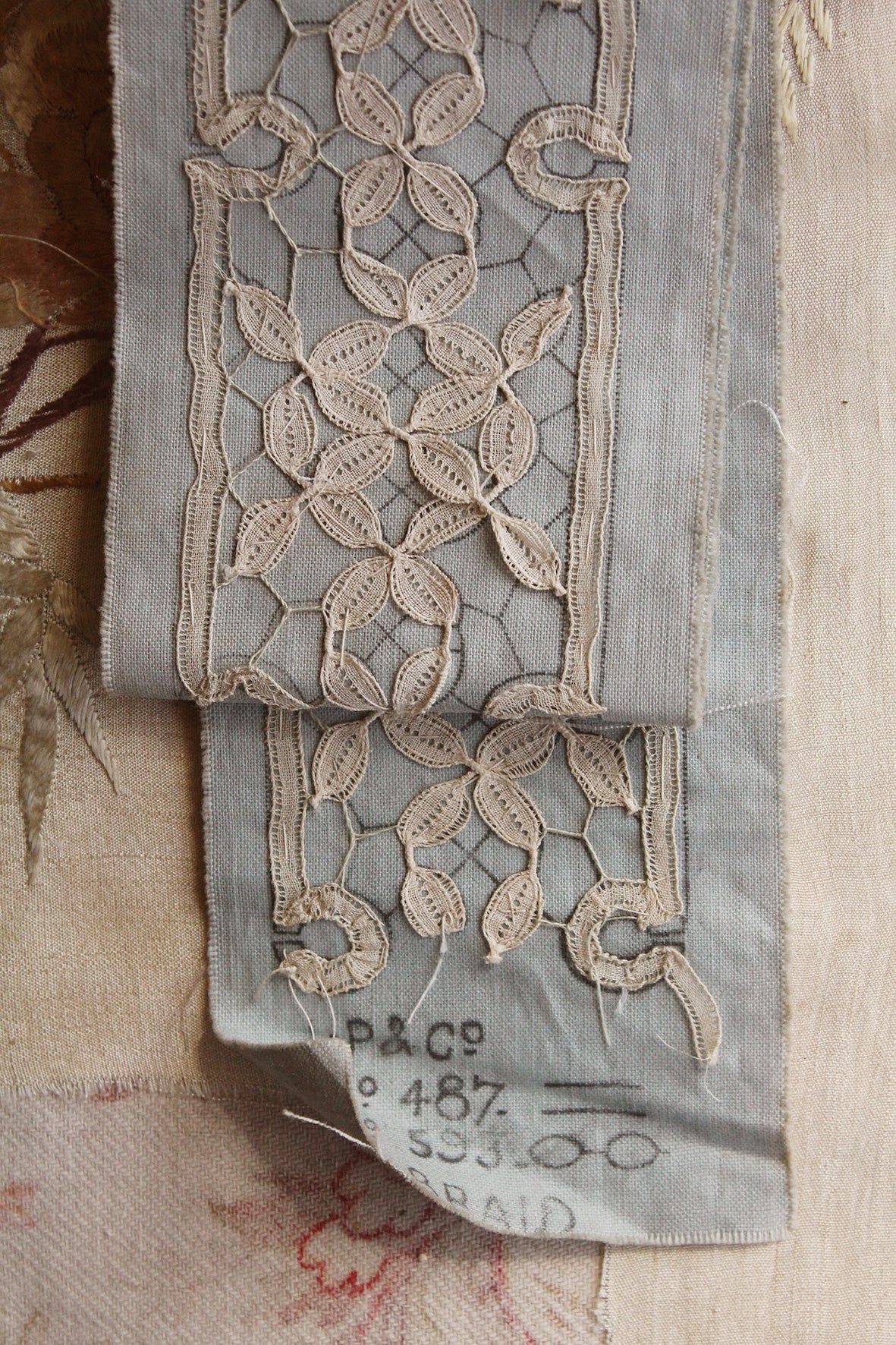 A beautiful unfinished lace template on original hand drawn patterned linen. The manufacturers identity details are to the base of the panel.