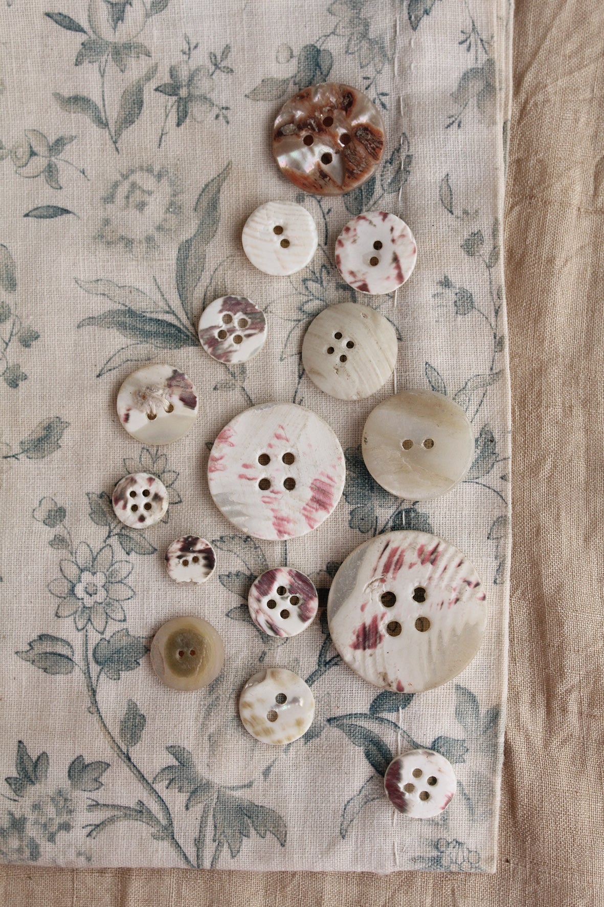 I've always been drawn to using the reverse of old mother of pearl buttons in projects. I adore how each has its own signature of mark, like a pebble on the beach.