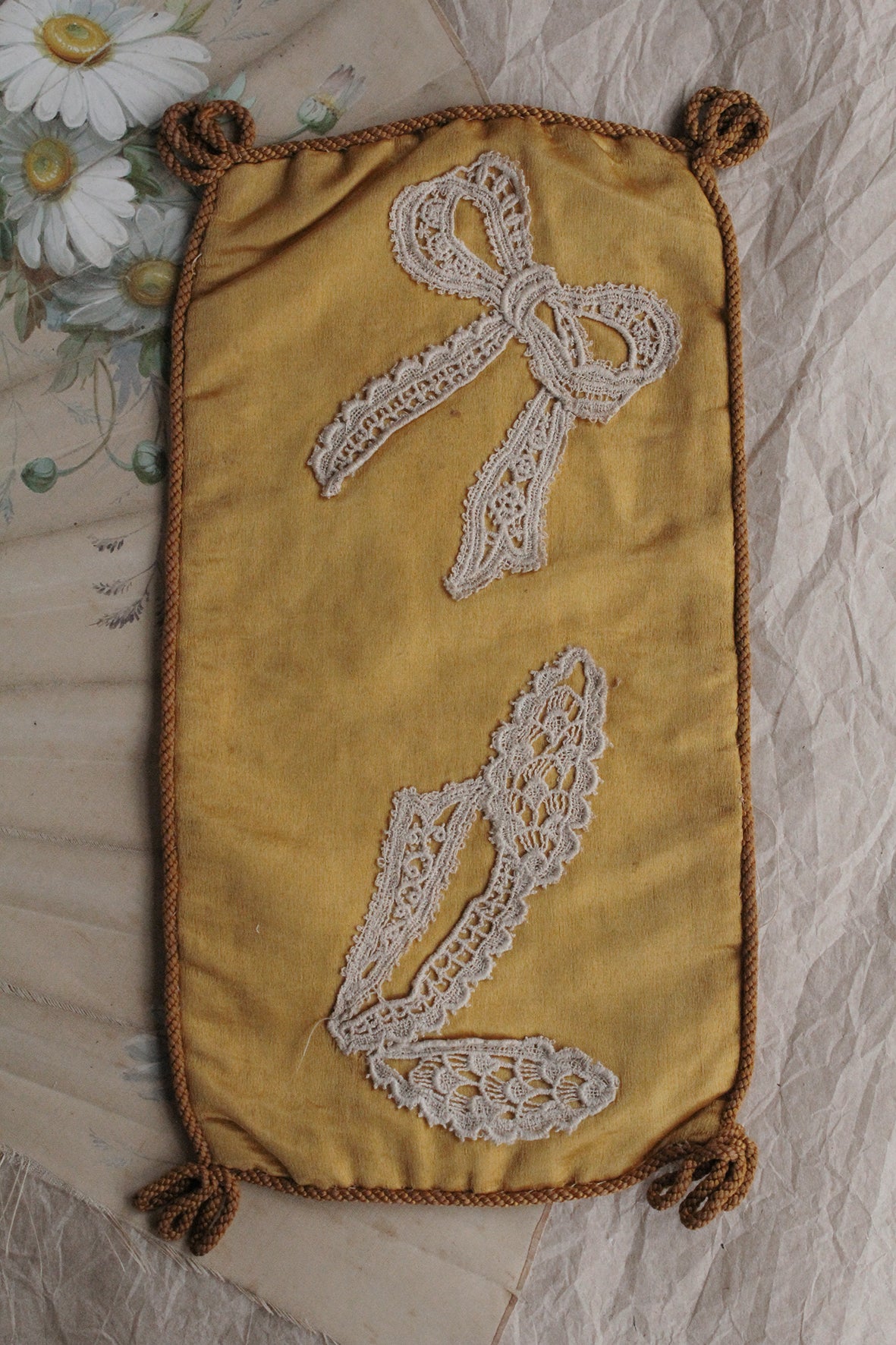 A beautiful old silk sampler. I purchased this as a collection of samplers, some of the linen samples are within this collection too. This demonstrates applique lace decoratives surface mounted onto a satin silk with stitch onto a silk ground with looped piped edging. The reverse is a fine silk too.