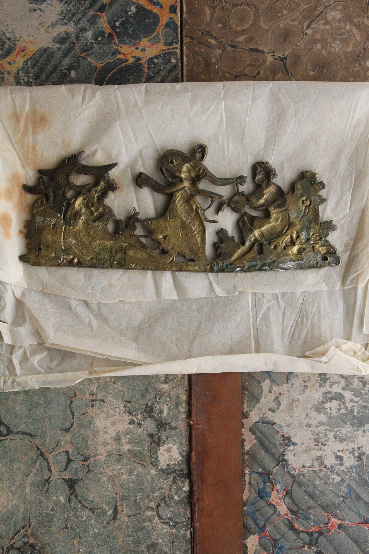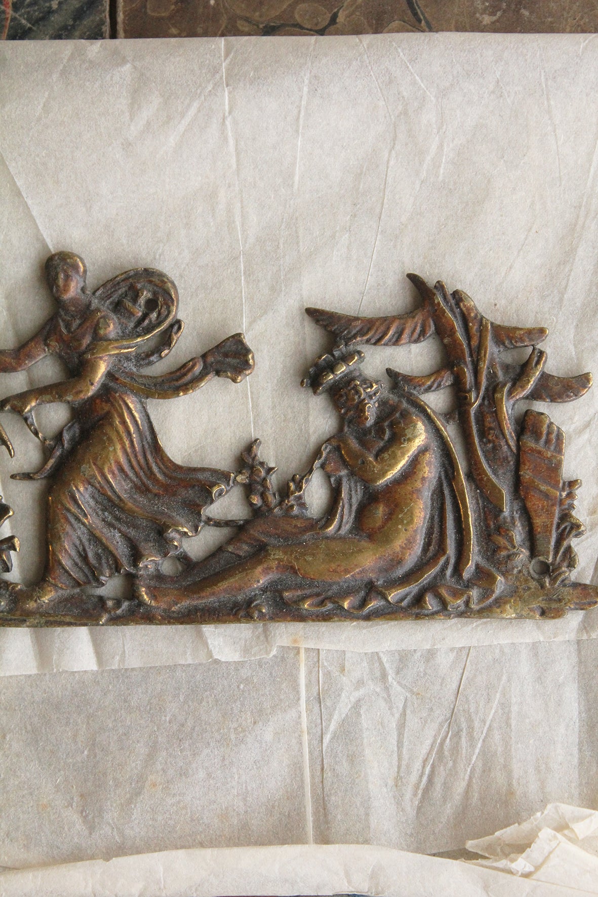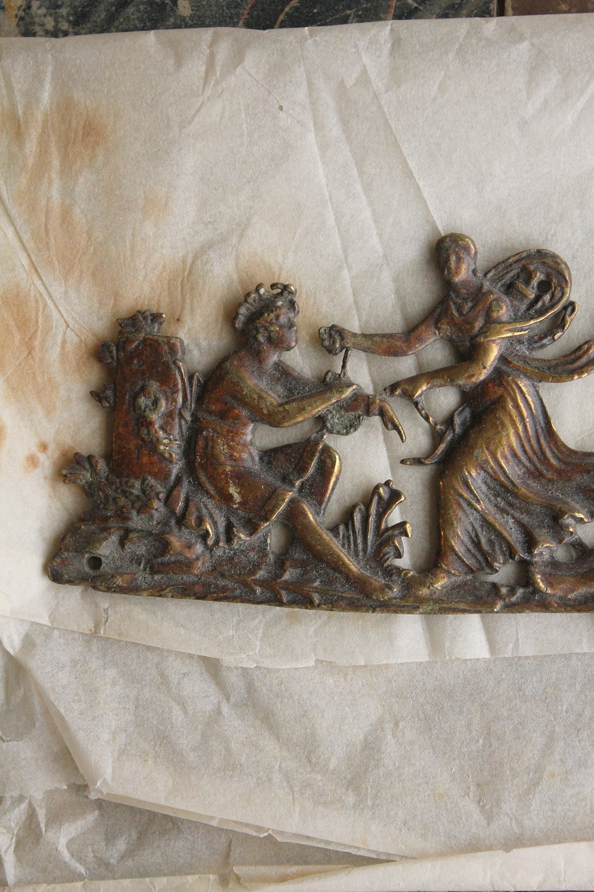 An antique brass plaque featuring a classical pastoral scene, I am unsure of the story/tale it is depicting.