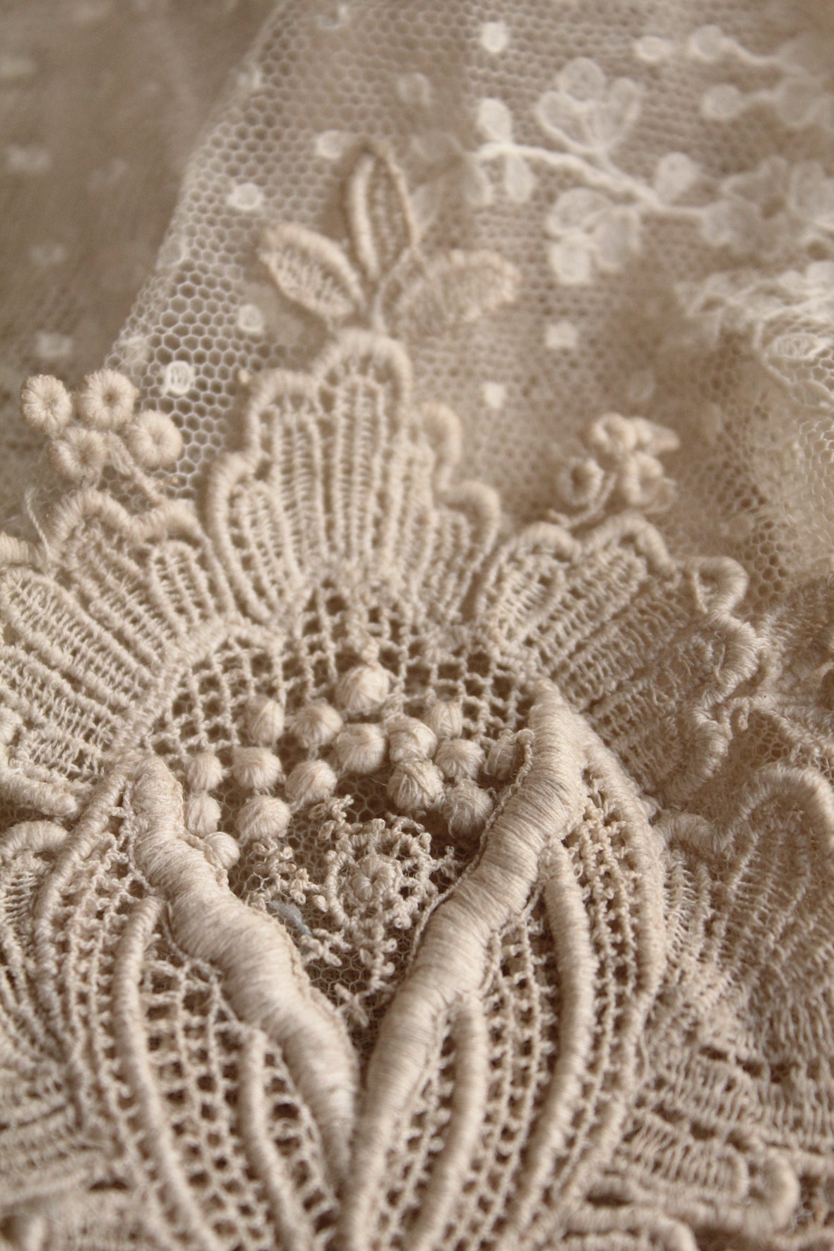 Two old lace reclaimed appliques, one is a peony style flower and the other is a foliage tile with little relief foliage detailing from the centre square. They are in lovely condition. There's a touch of discolouration from age.