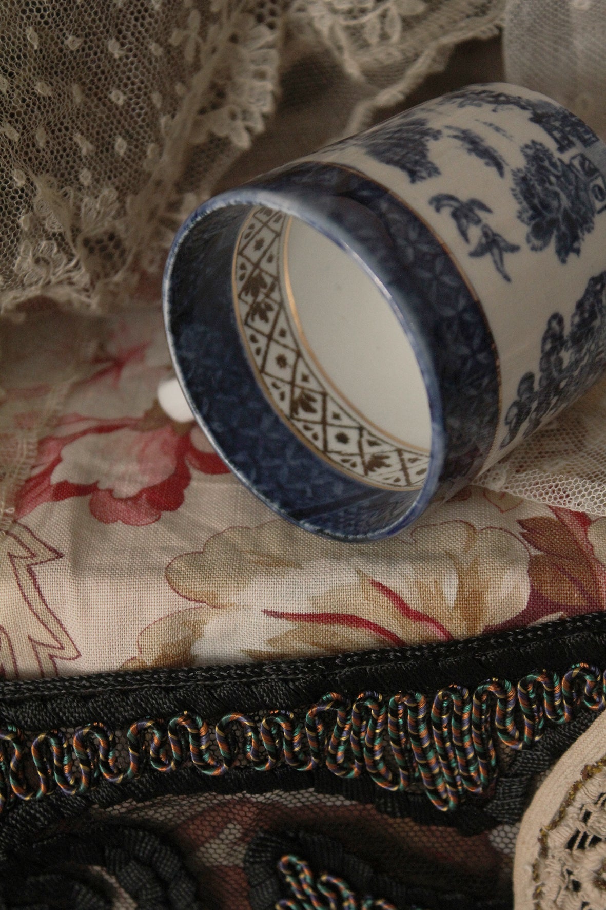 The cup is also decorated on the inside with a ribbon of blue and gold.