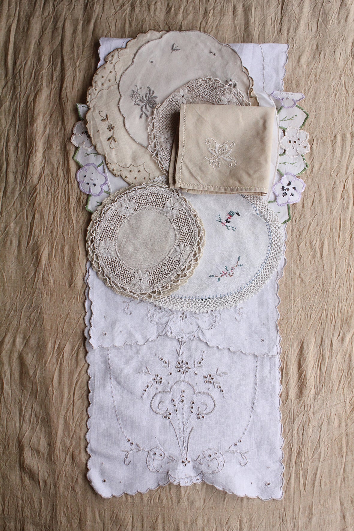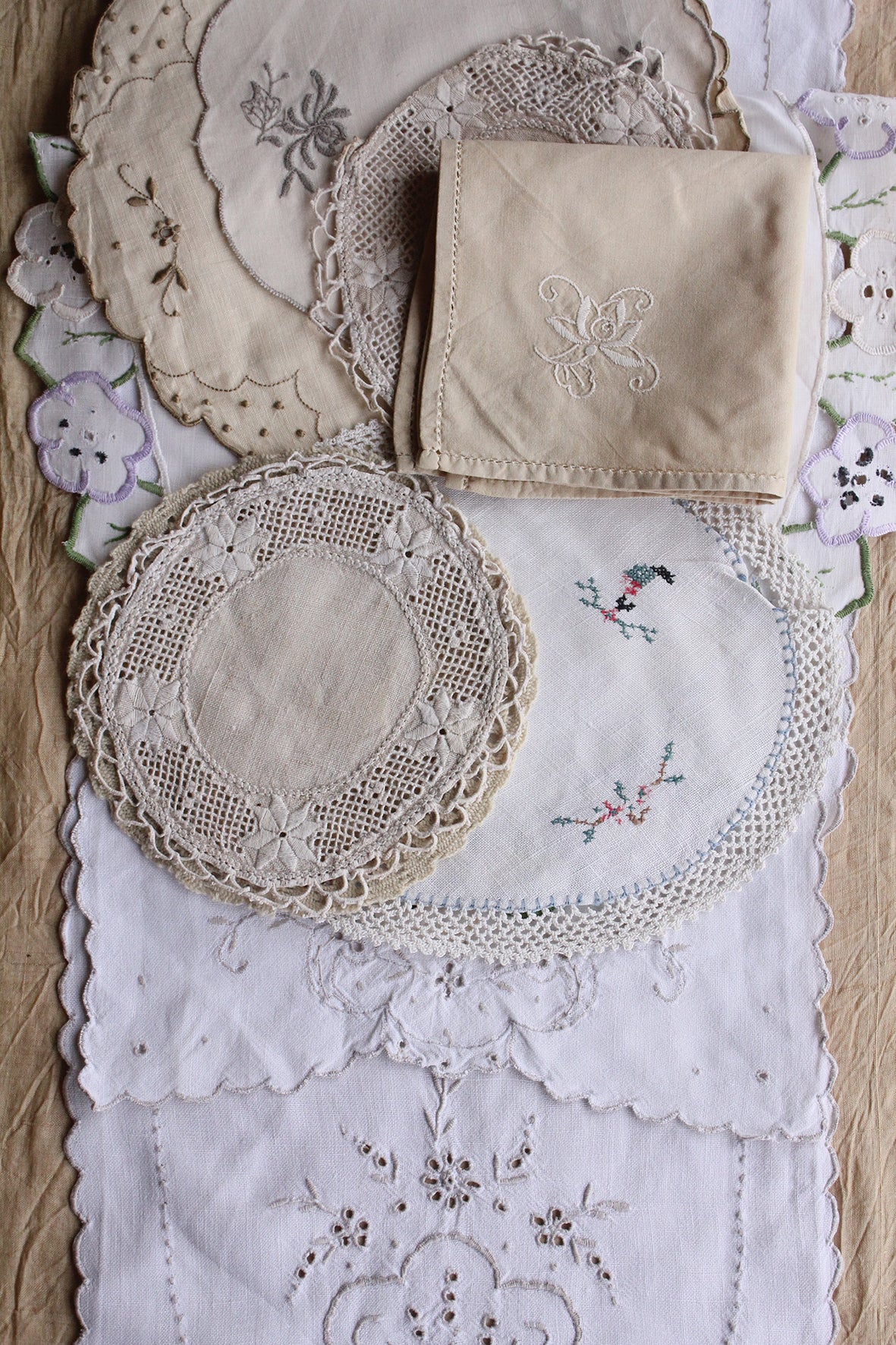 Old table linen is always so detailed in style of hem, lace, embroidery, motif and design. This collection is a gorgeous collection of linen and cotton. You may choose to embroider back into the empty spaces or centre of a circular mat, you may have space for the odd piece around your home, or use within a lovely making project.