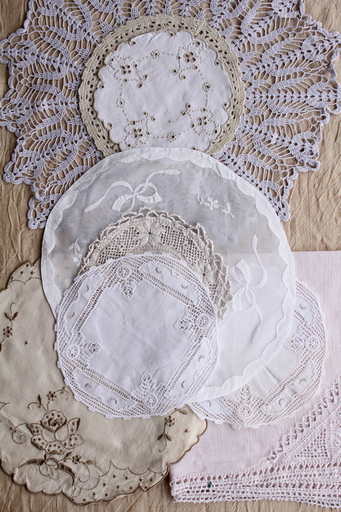 Old table linen is always so detailed in style of hem, lace, embroidery, motif and design. This collection is a gorgeous collection of linen and cotton. You may choose to embroider back into the empty spaces or centre of a circular mat, you may have space for the odd piece around your home, or use within a lovely making project.