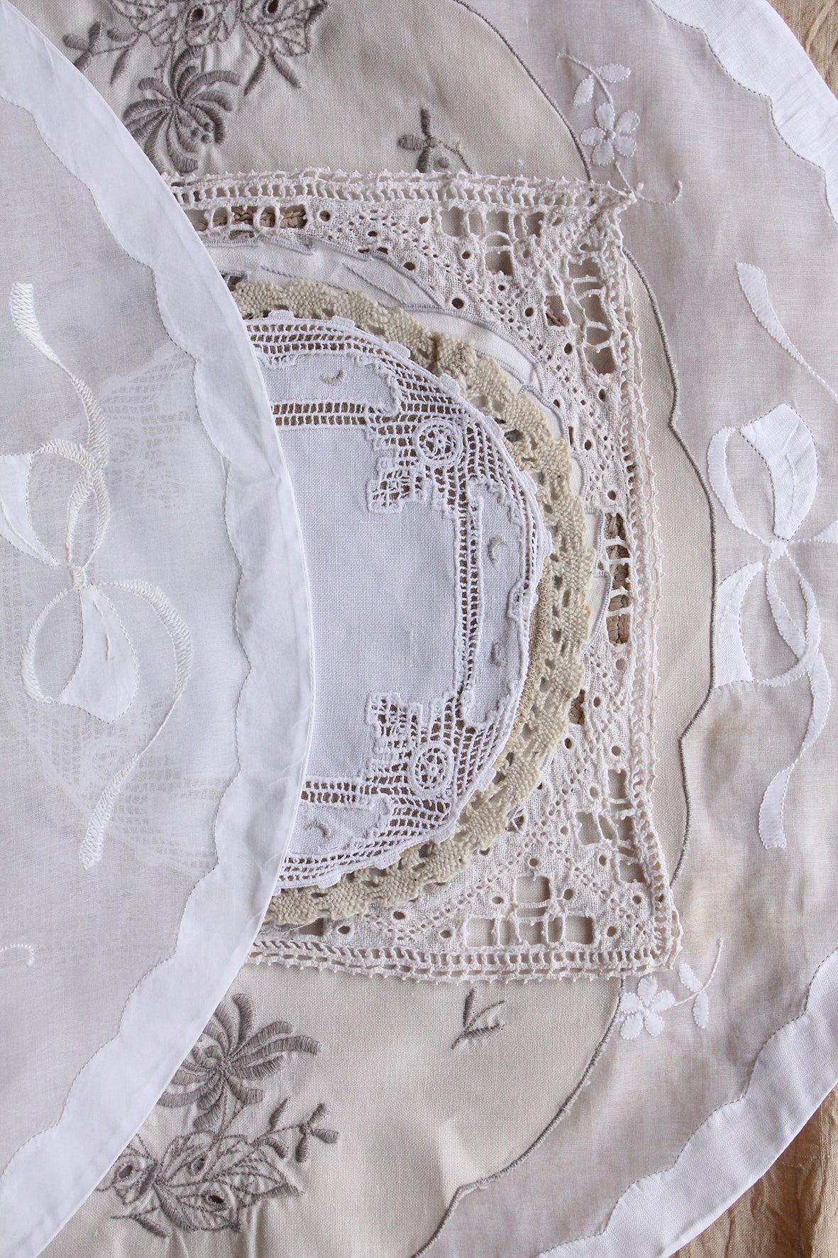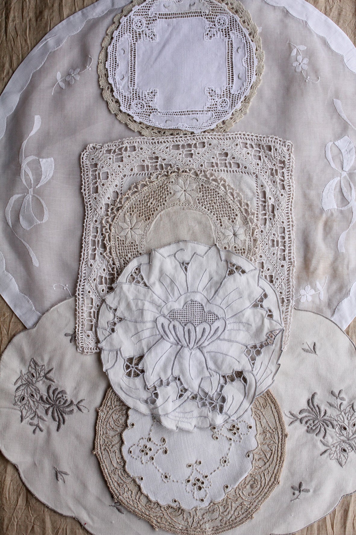 Old table linen is always so detailed in style of hem, lace, embroidery, motif and design. This collection is a gorgeous collection of linen and cotton. You may choose to embroider back into the empty spaces or centre of a circular mat, you may have space for the odd piece around your home, or use within a lovely making project.