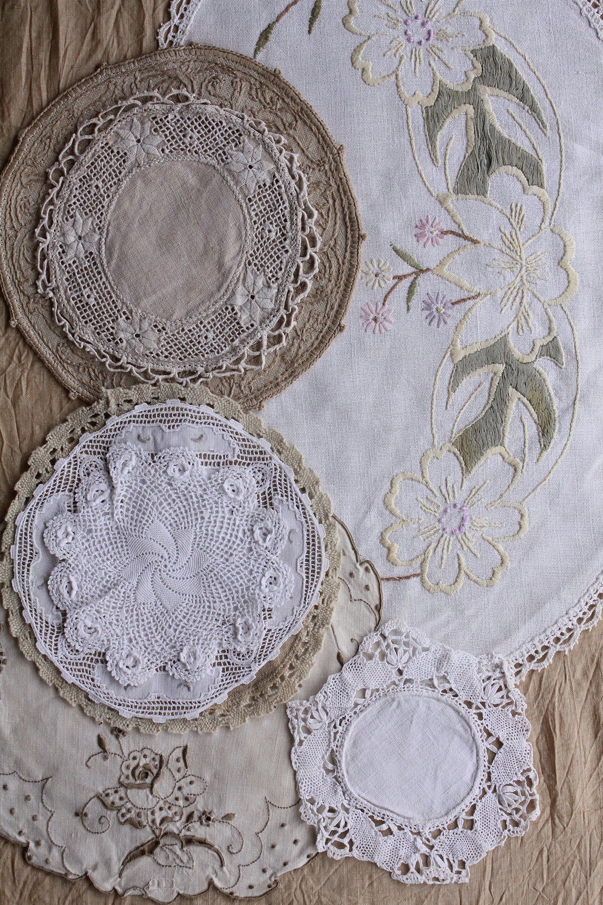 Old table linen is always so detailed in style of hem, lace, embroidery, motif and design. This collection is a gorgeous collection of linen and cotton. You may choose to embroider back into the empty spaces or centre of a circular mat, you may have space for the odd piece around your home, or use within a lovely making project.