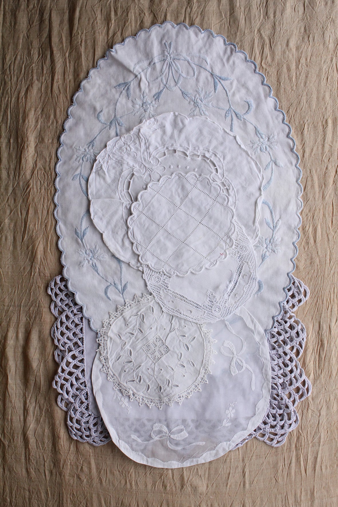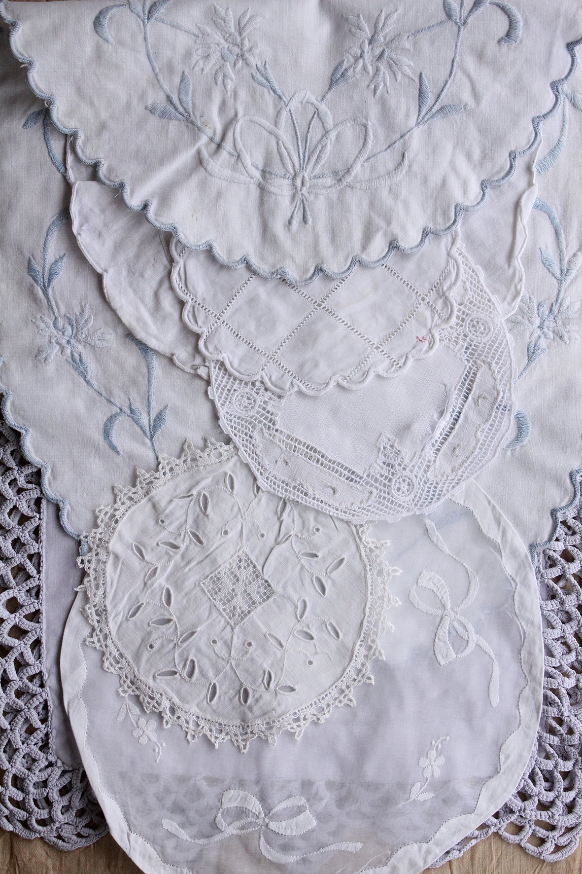 Old table linen is always so detailed in style of hem, lace, embroidery, motif and design. This collection is a gorgeous collection of linen and cotton. You may choose to embroider back into the empty spaces or centre of a circular mat, you may have space for the odd piece around your home, or use within a lovely making project.