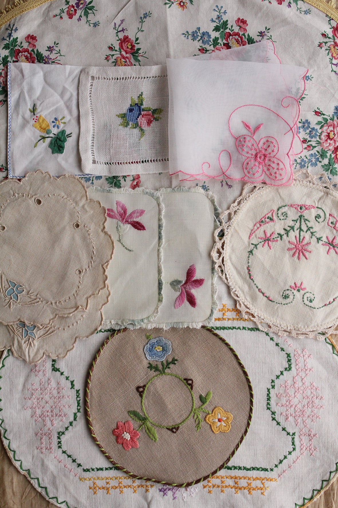 Old table linen is always so detailed in style of hem, lace, embroidery, motif and design. This collection is a gorgeous collection of linen and cotton. You may choose to embroider back into the empty spaces or centre of a circular mat, you may have space for the odd piece around your home, or use within a lovely making project.