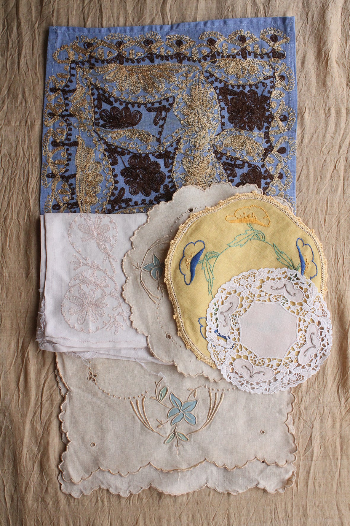 Old table linen is always so detailed in style of hem, lace, embroidery, motif and design. This collection is a gorgeous collection of linen and cotton. You may choose to embroider back into the empty spaces or centre of a circular mat, you may have space for the odd piece around your home, or use within a lovely making project.