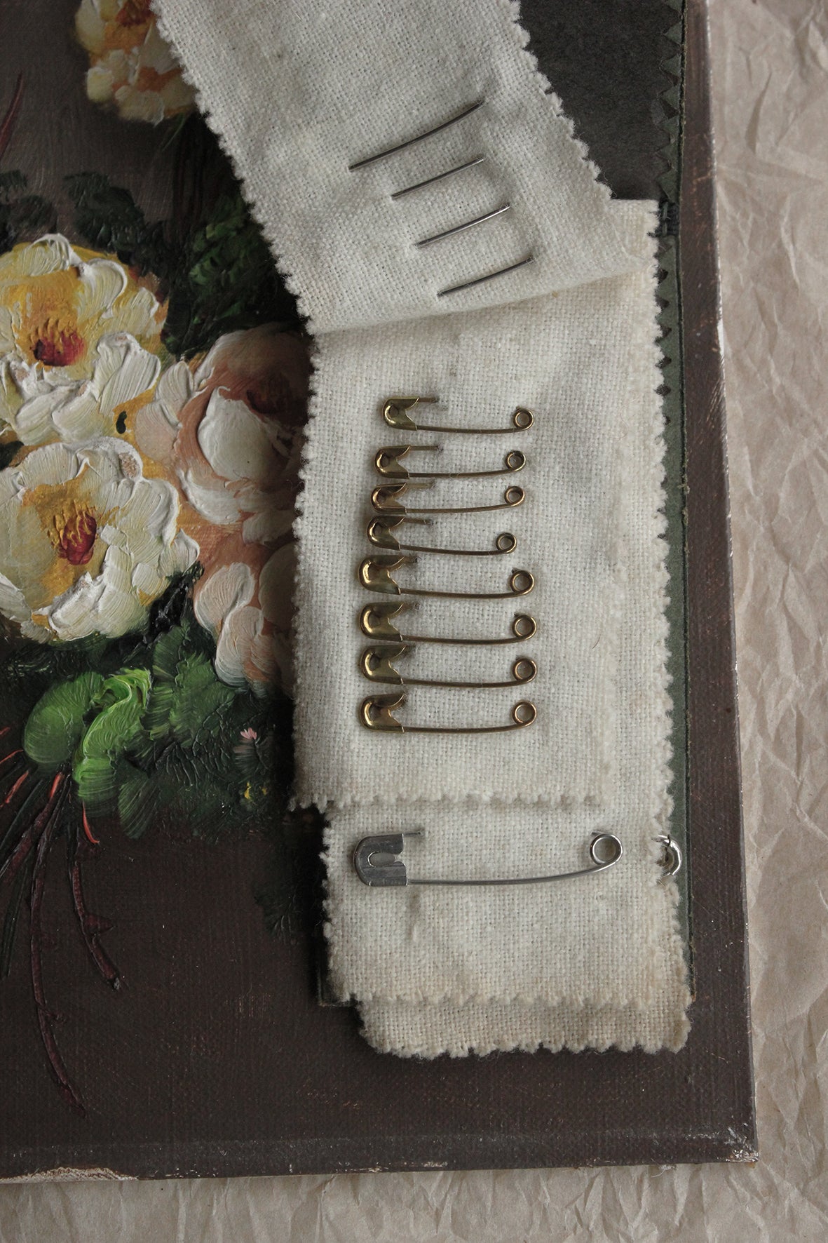An old case with wool pinked edge pages containing a variety of equally old safety pins. Some steel and some brass.