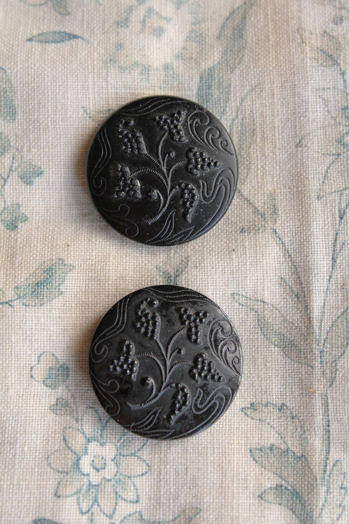 A collection of two glass buttons with an etched floral and filligree design.