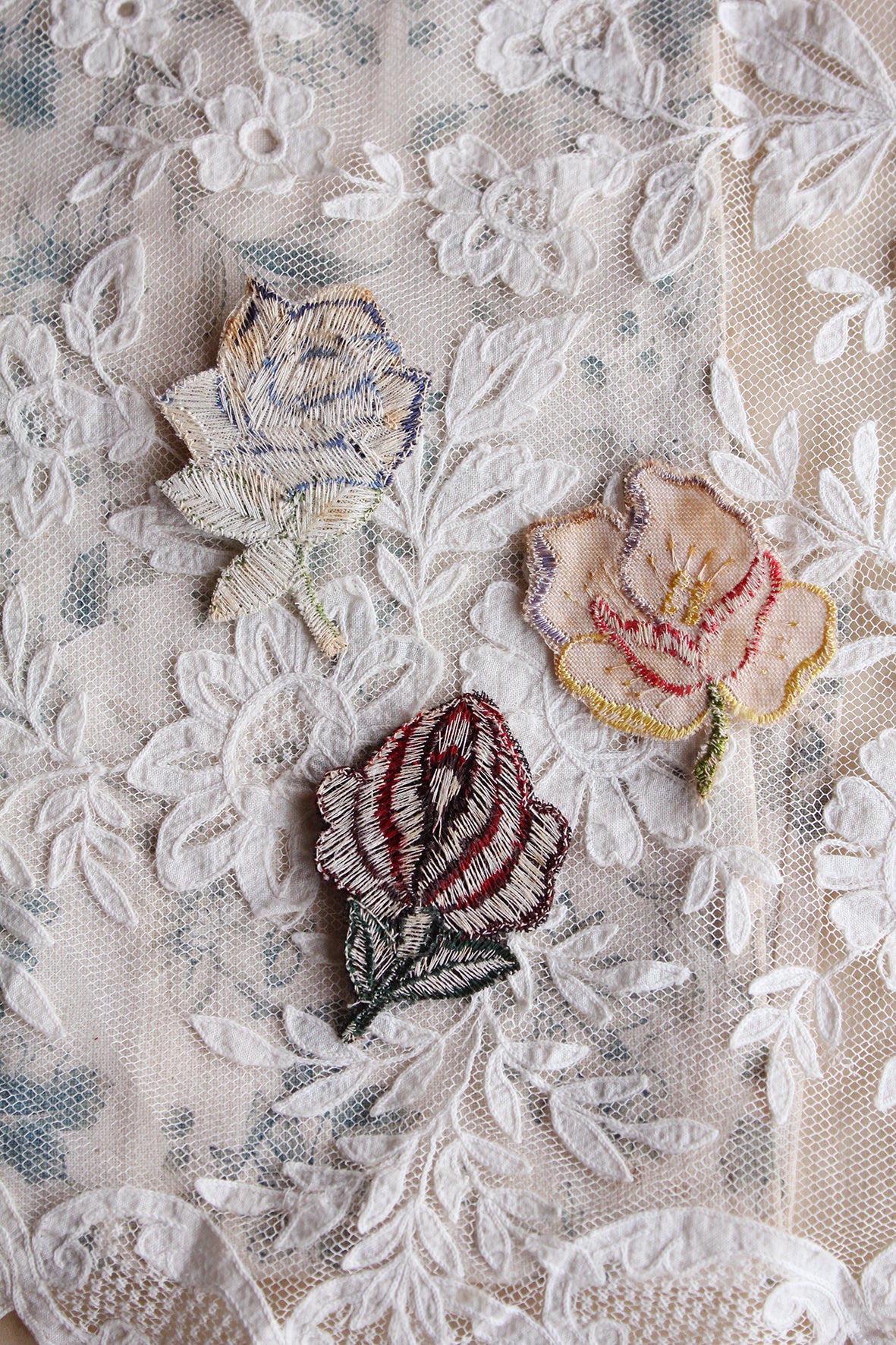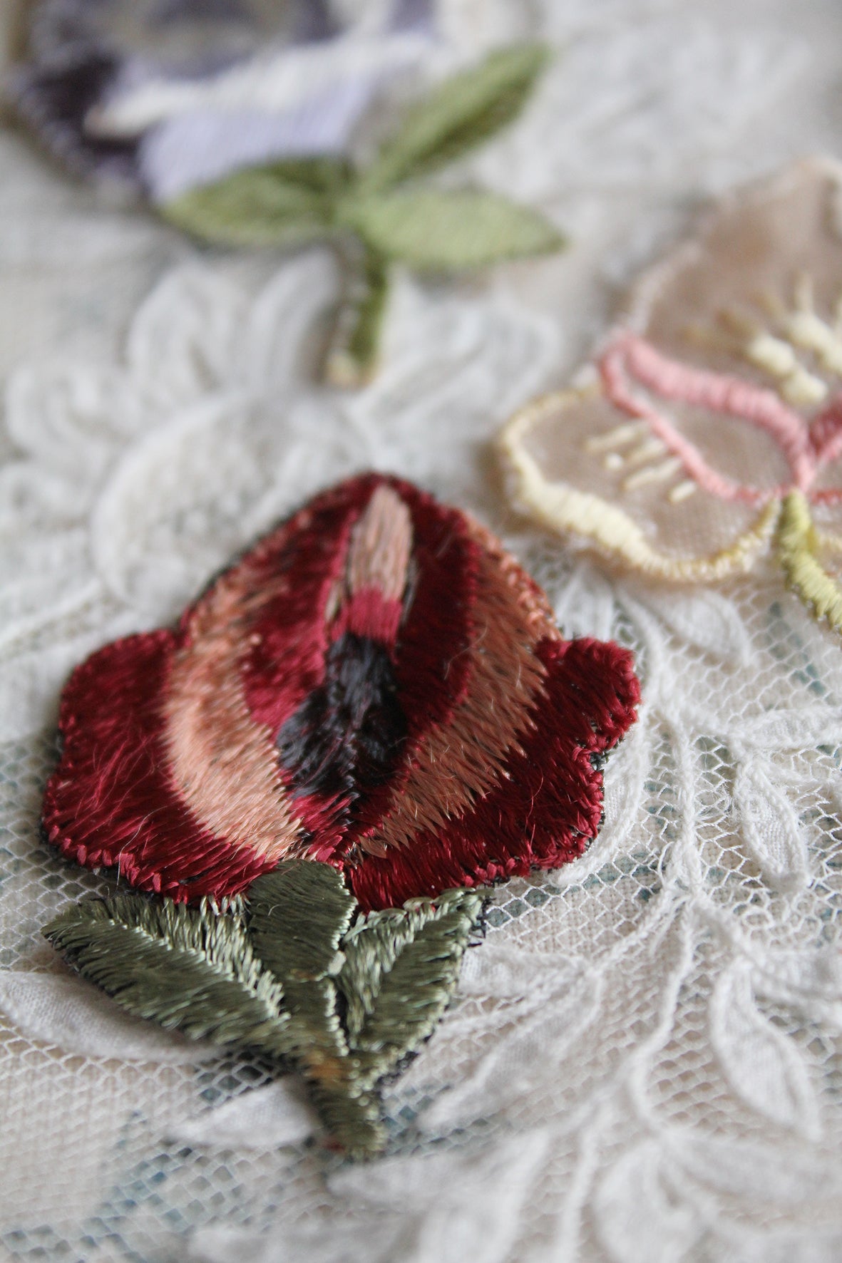 A beautiful collection of embroidered late Victorian floral appliques. I have done a little research on these pieces and not only were they used in costume and fashions of there time but they were also used within stitched artwork where the florals were stitched together to form a more three dimensional composition and presented in a dome style frame.