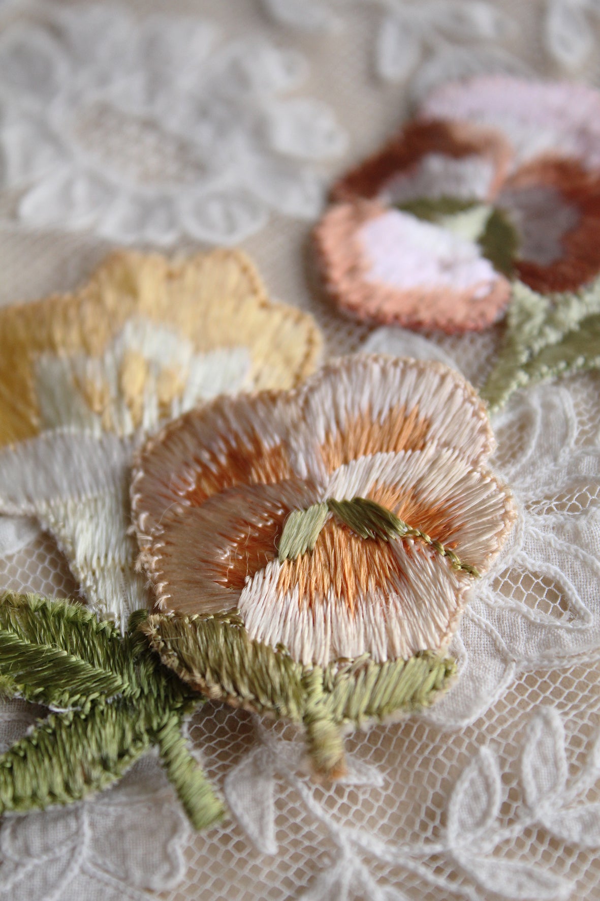 A beautiful collection of embroidered late Victorian floral appliques. I have done a little research on these pieces and not only were they used in costume and fashions of there time but they were also used within stitched artwork where the florals were stitched together to form a more three dimensional composition and presented in a dome style frame.