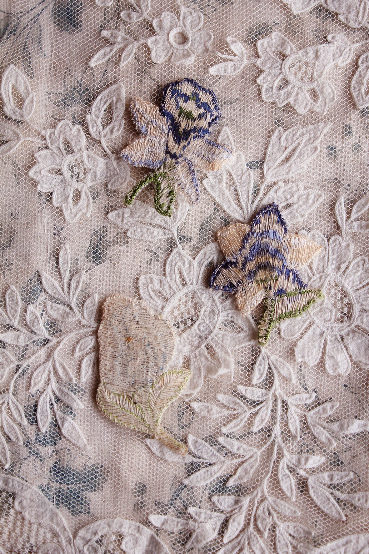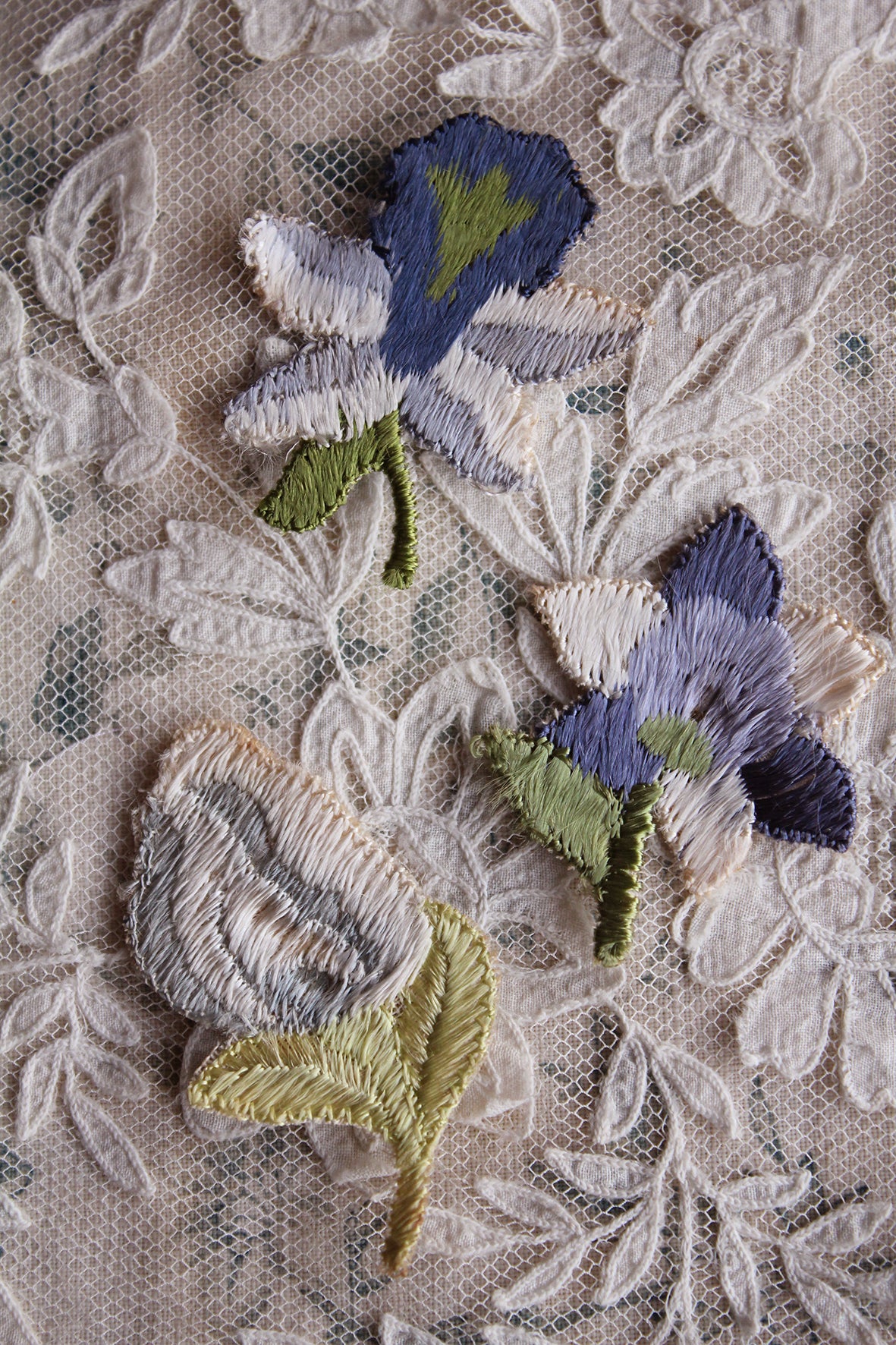 A beautiful collection of embroidered late Victorian floral appliques. I have done a little research on these pieces and not only were they used in costume and fashions of there time but they were also used within stitched artwork where the florals were stitched together to form a more three dimensional composition and presented in a dome style frame.