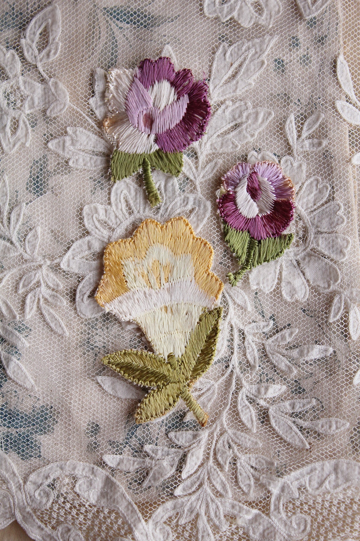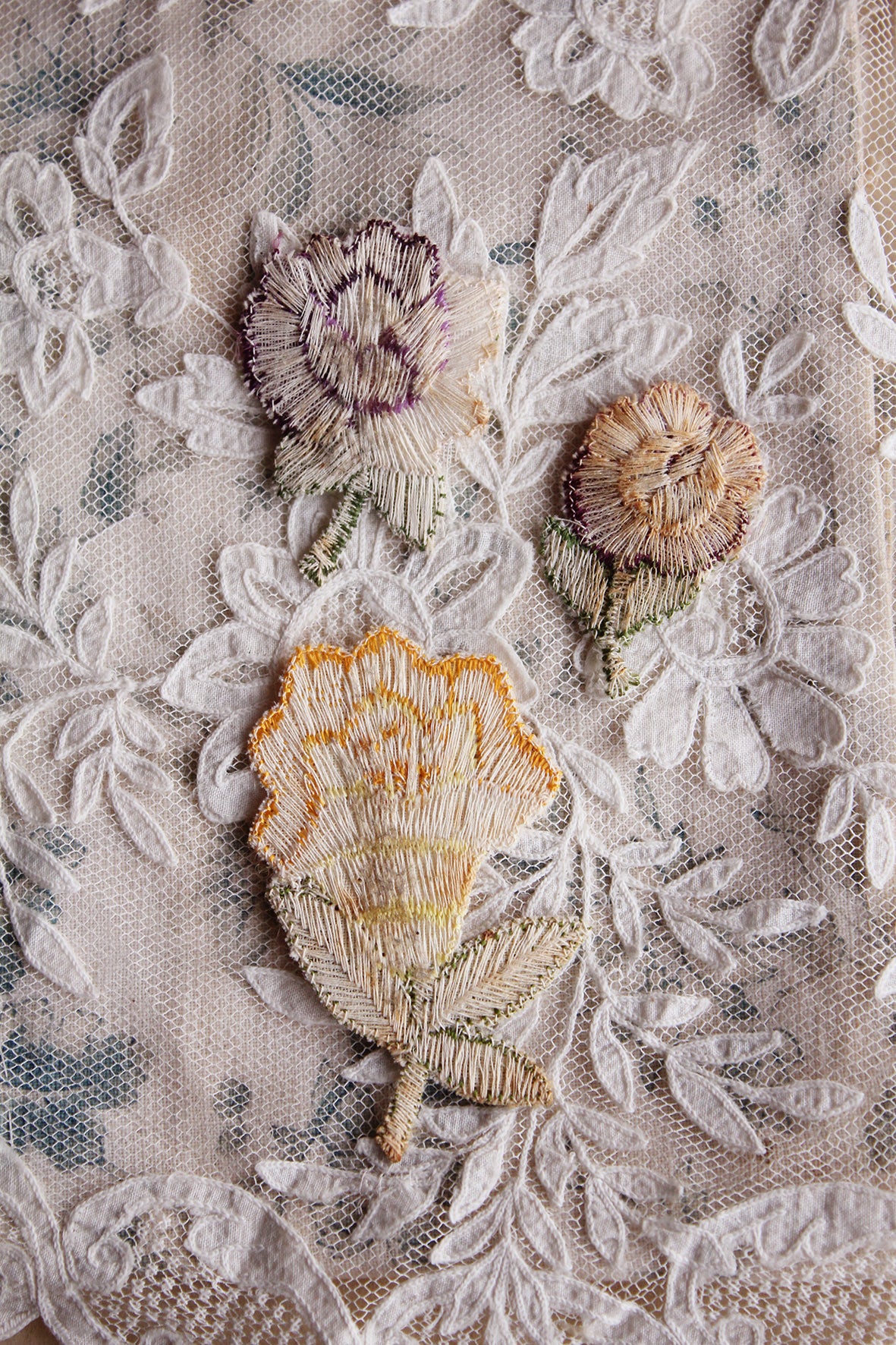 A beautiful collection of embroidered late Victorian floral appliques. I have done a little research on these pieces and not only were they used in costume and fashions of there time but they were also used within stitched artwork where the florals were stitched together to form a more three dimensional composition and presented in a dome style frame.