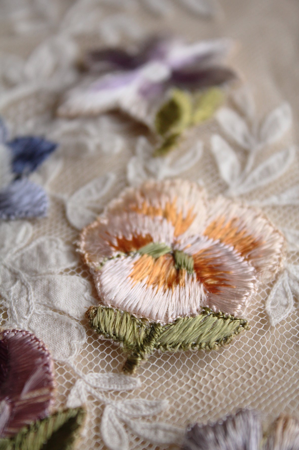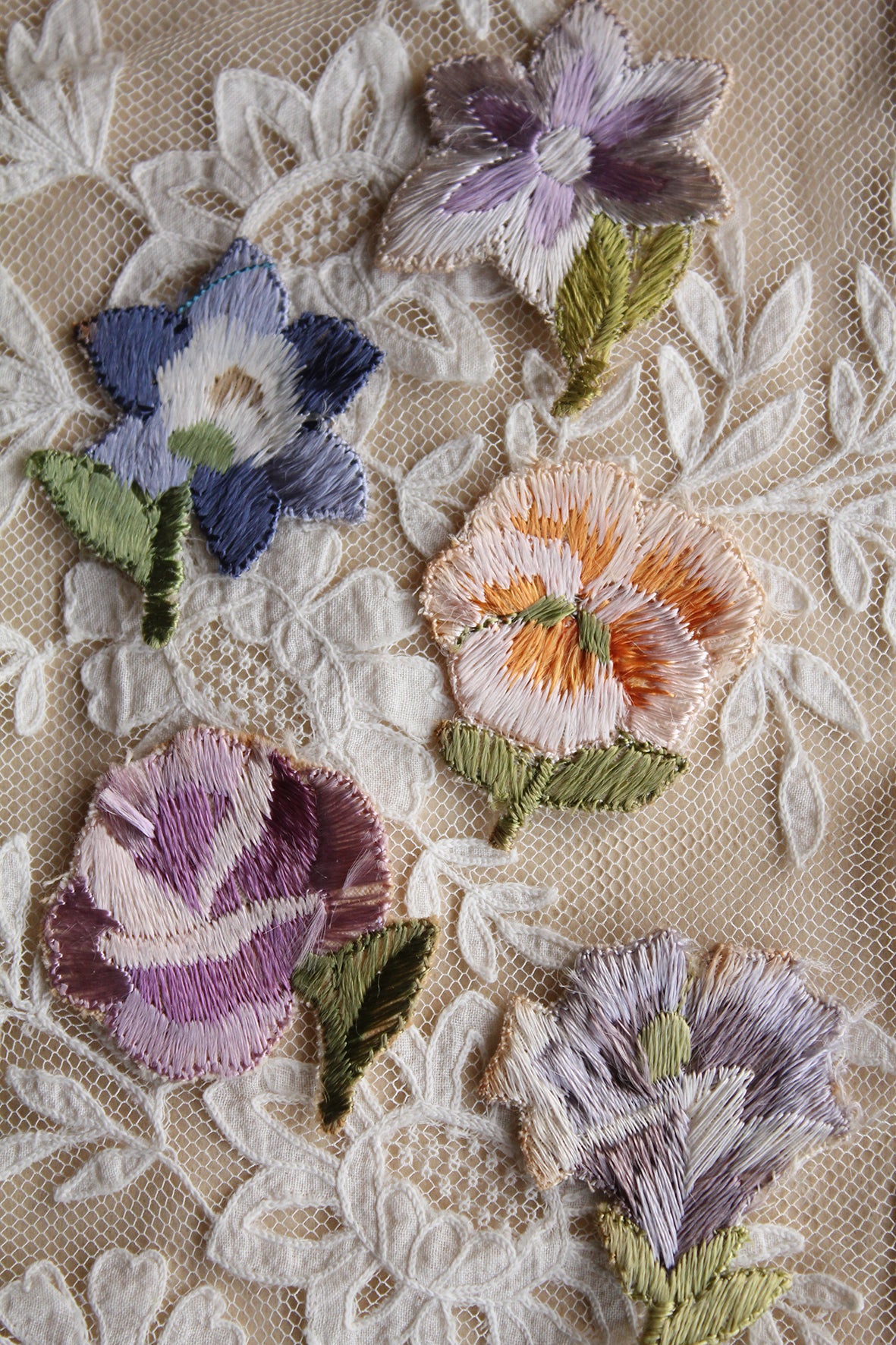 A beautiful collection of embroidered late Victorian floral appliques. I have done a little research on these pieces and not only were they used in costume and fashions of there time but they were also used within stitched artwork where the florals were stitched together to form a more three dimensional composition and presented in a dome style frame.