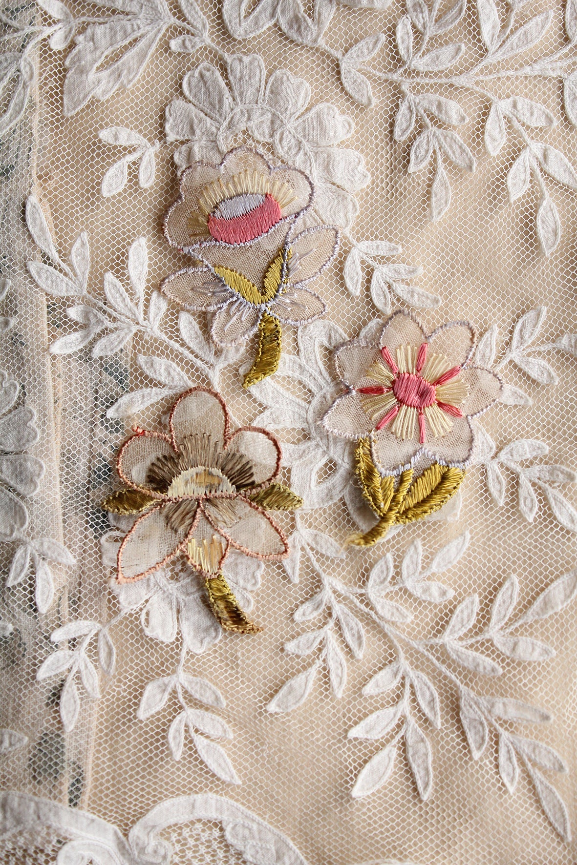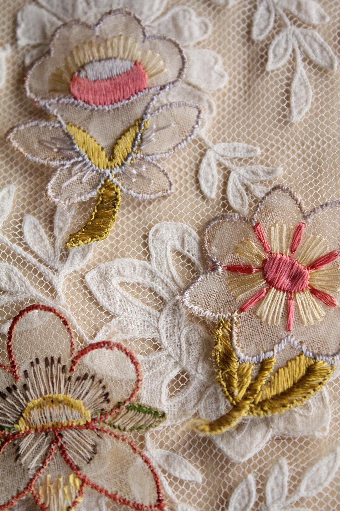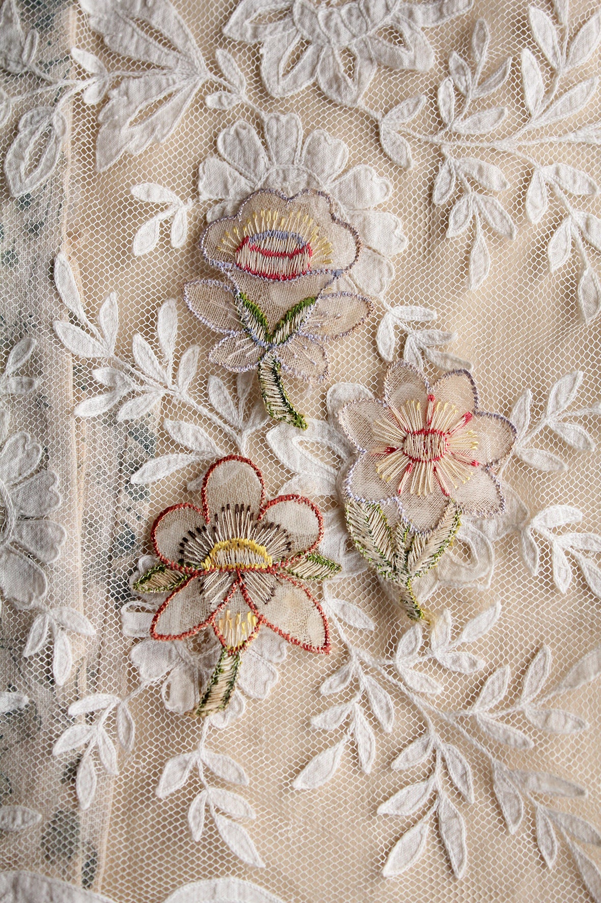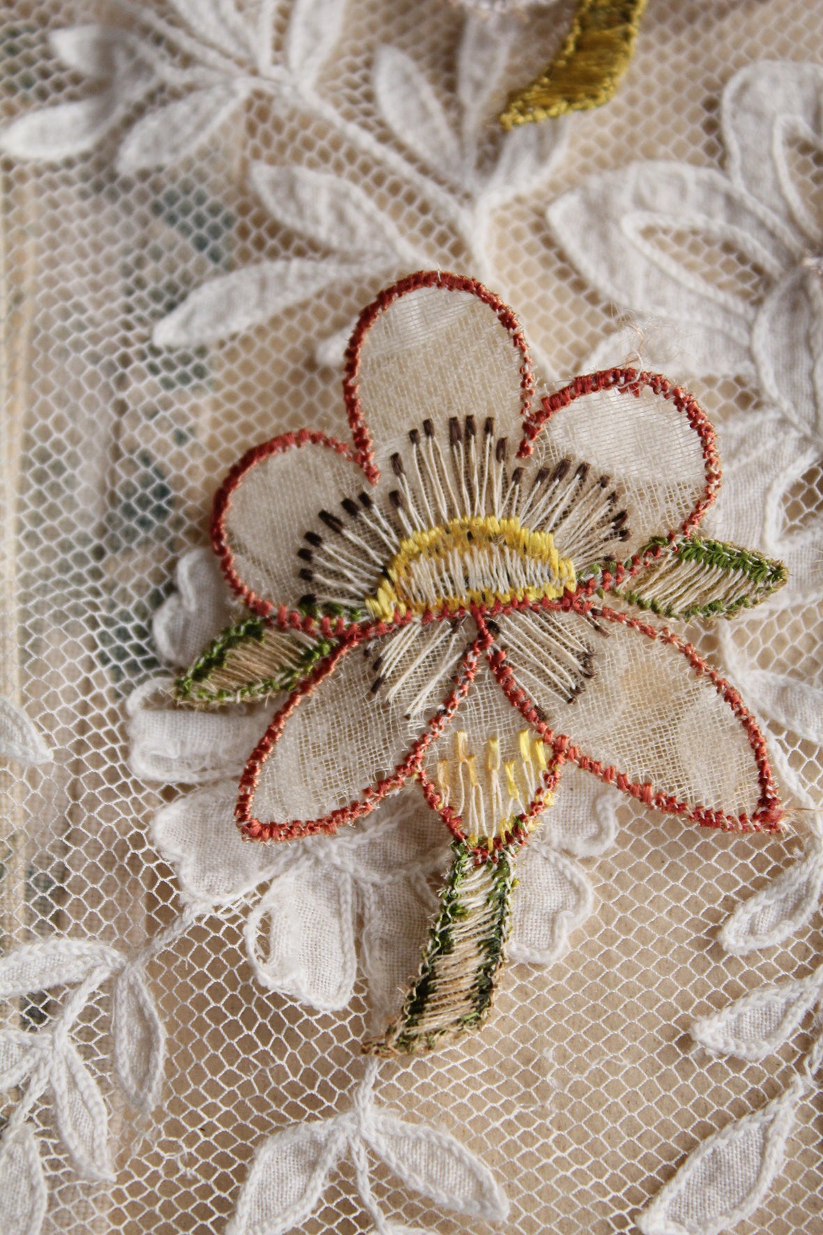 A beautiful collection of embroidered late Victorian floral appliques. I have done a little research on these pieces and not only were they used in costume and fashions of there time but they were also used within stitched artwork where the florals were stitched together to form a more three dimensional composition and presented in a dome style frame.