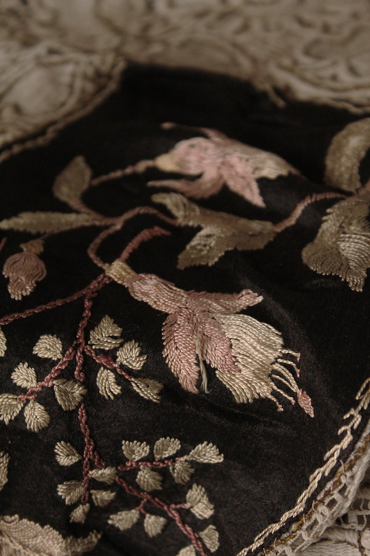 A detailed Victorian mat that has a wide heavy lace border edging that too has hand embroidery detailing along with couched stitching around the floral motifs. The centre is a panel of hand embroidery with silk stitching on a silk ground. There is a border of fine gold metal thread detailing all around the edge.