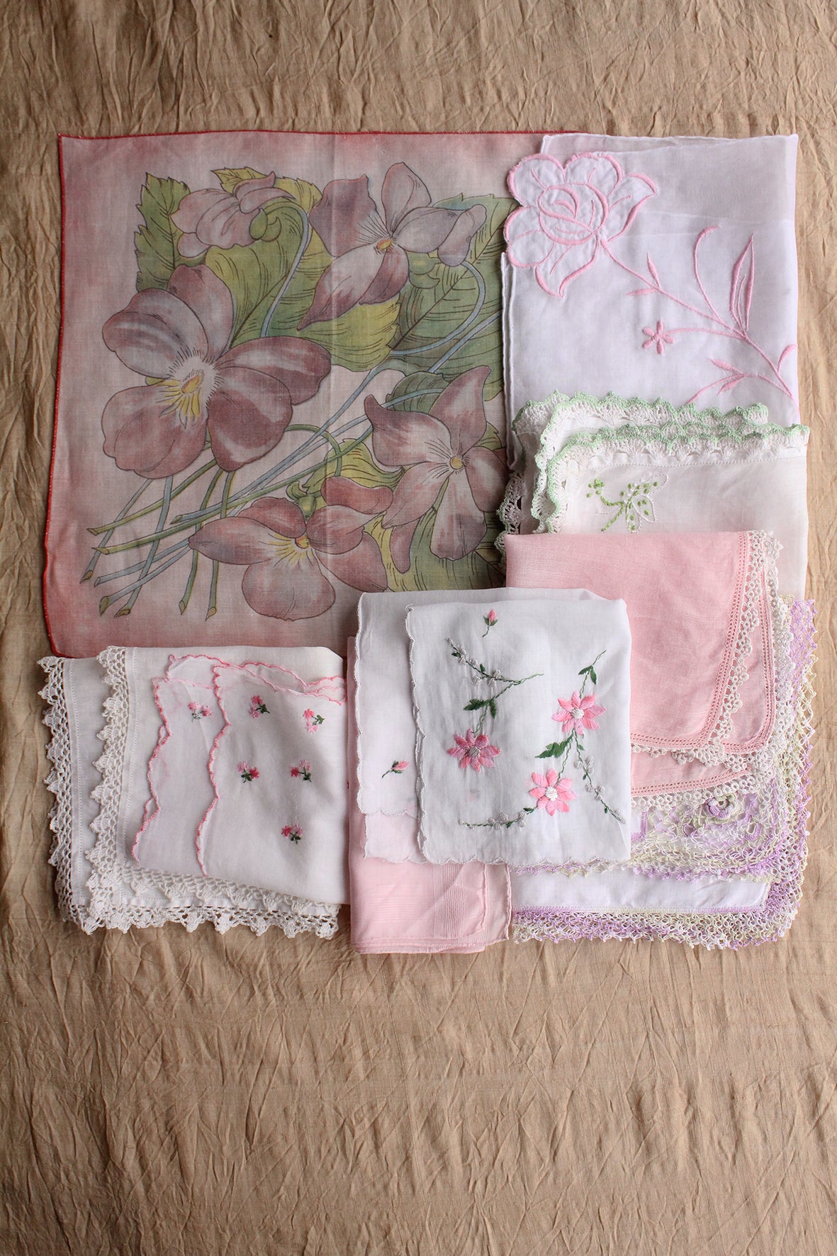 Vintage handkerchiefs are so good to use in all kinds of small projects. You may choose to purchase a couple and make some bunting for your garden. You may choose to iron paper backed bona web to the reverse (this stops from fraying and allows you to adhere to fabric and wood with an iron) and cut out the flowers to adorn your work. Many many uses.