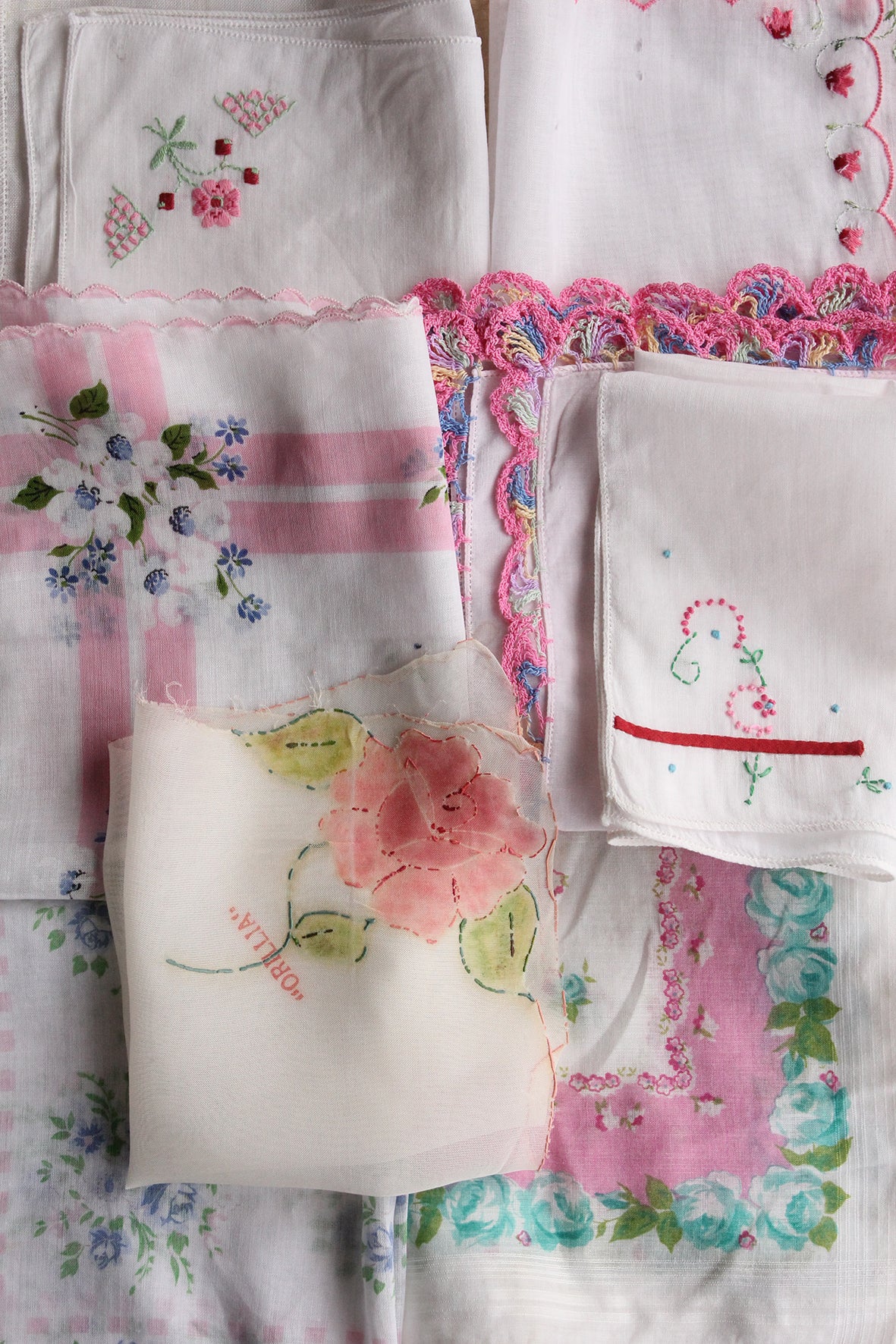 Vintage handkerchiefs are so good to use in all kinds of small projects. You may choose to purchase a couple and make some bunting for your garden. You may choose to iron paper backed bona web to the reverse (this stops from fraying and allows you to adhere to fabric and wood with an iron) and cut out the flowers to adorn your work. Many many uses.