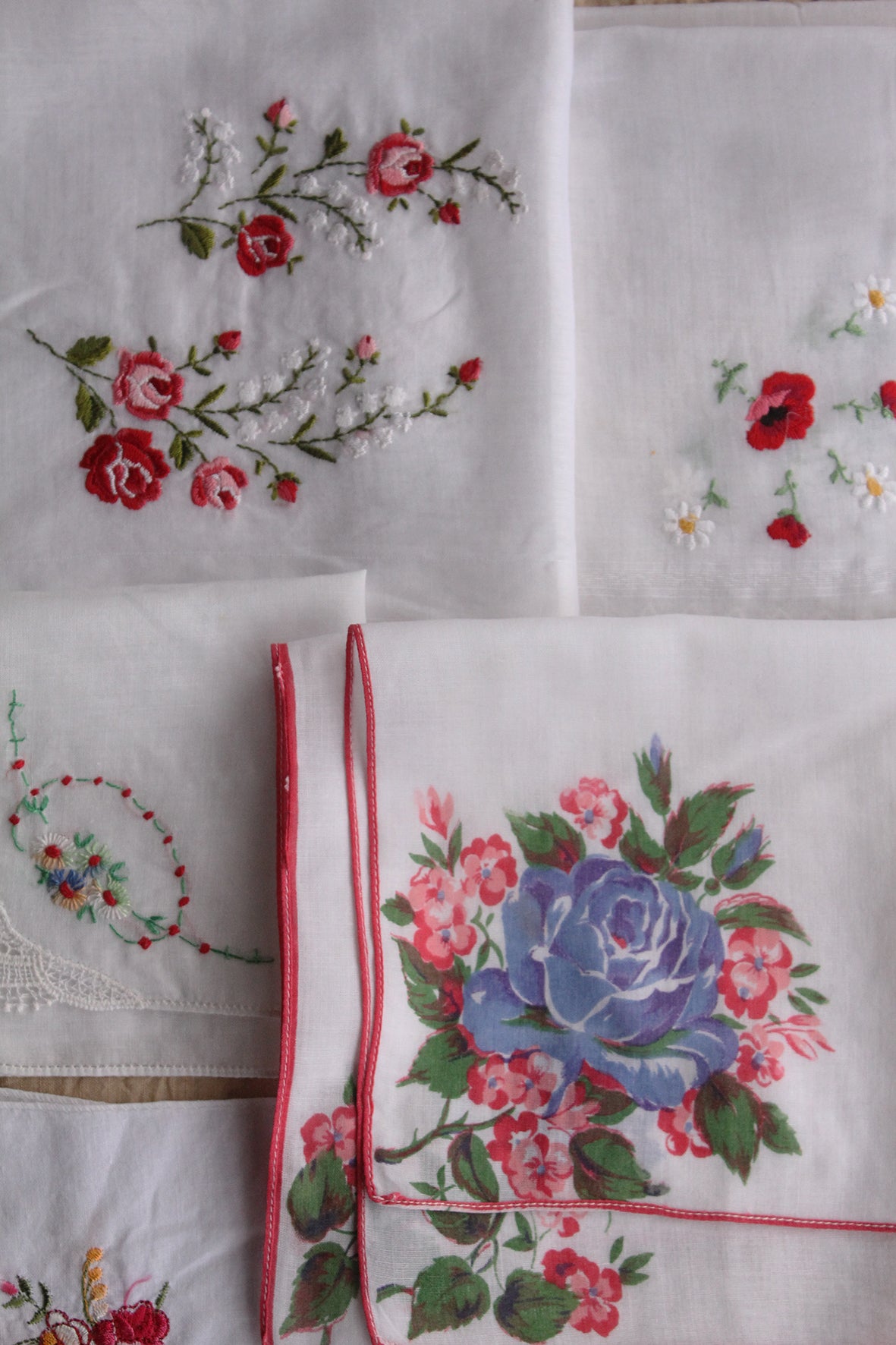 Vintage handkerchiefs are so good to use in all kinds of small projects. You may choose to purchase a couple and make some bunting for your garden. You may choose to iron paper backed bona web to the reverse (this stops from fraying and allows you to adhere to fabric and wood with an iron) and cut out the flowers to adorn your work. Many many uses.