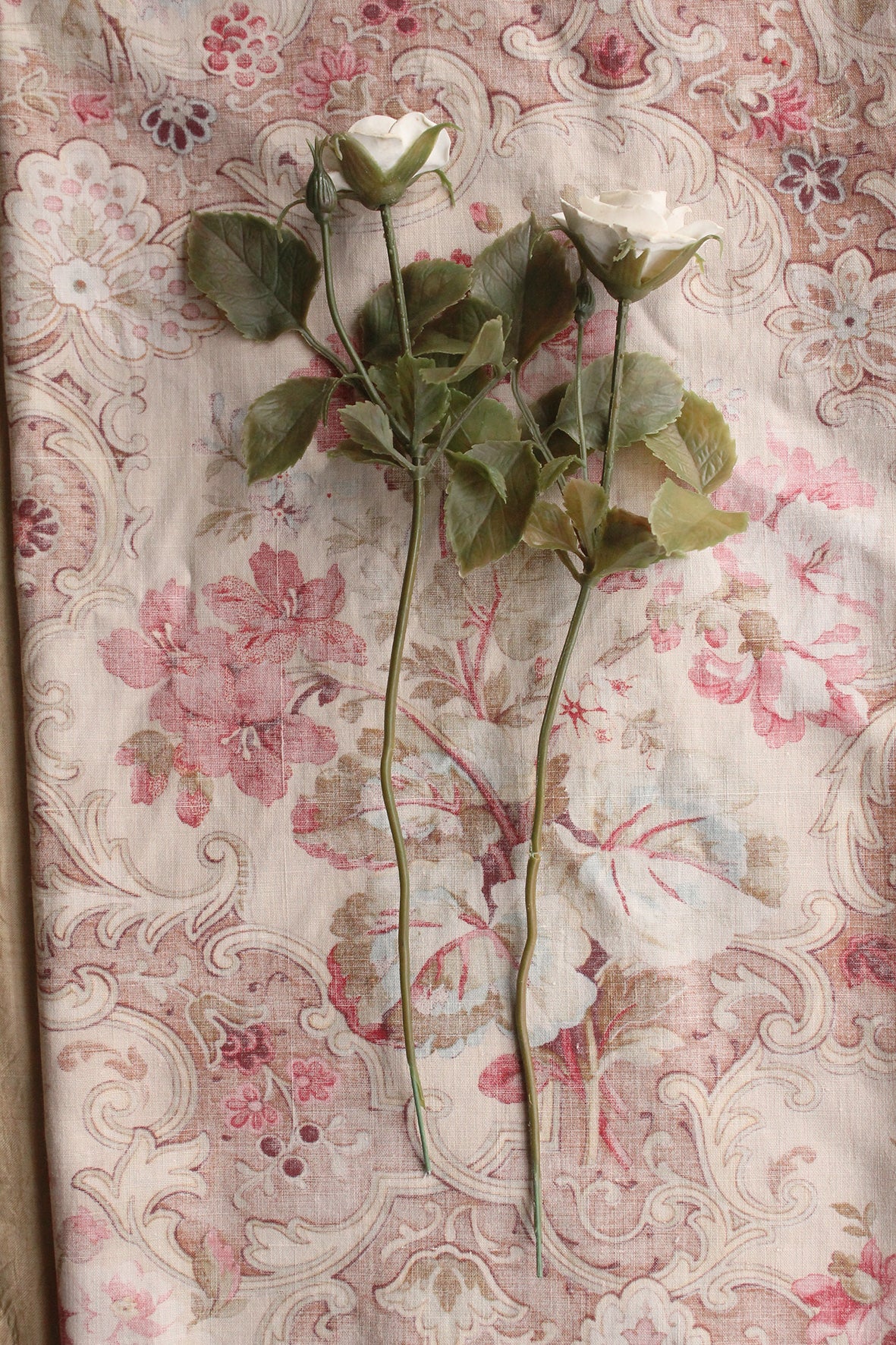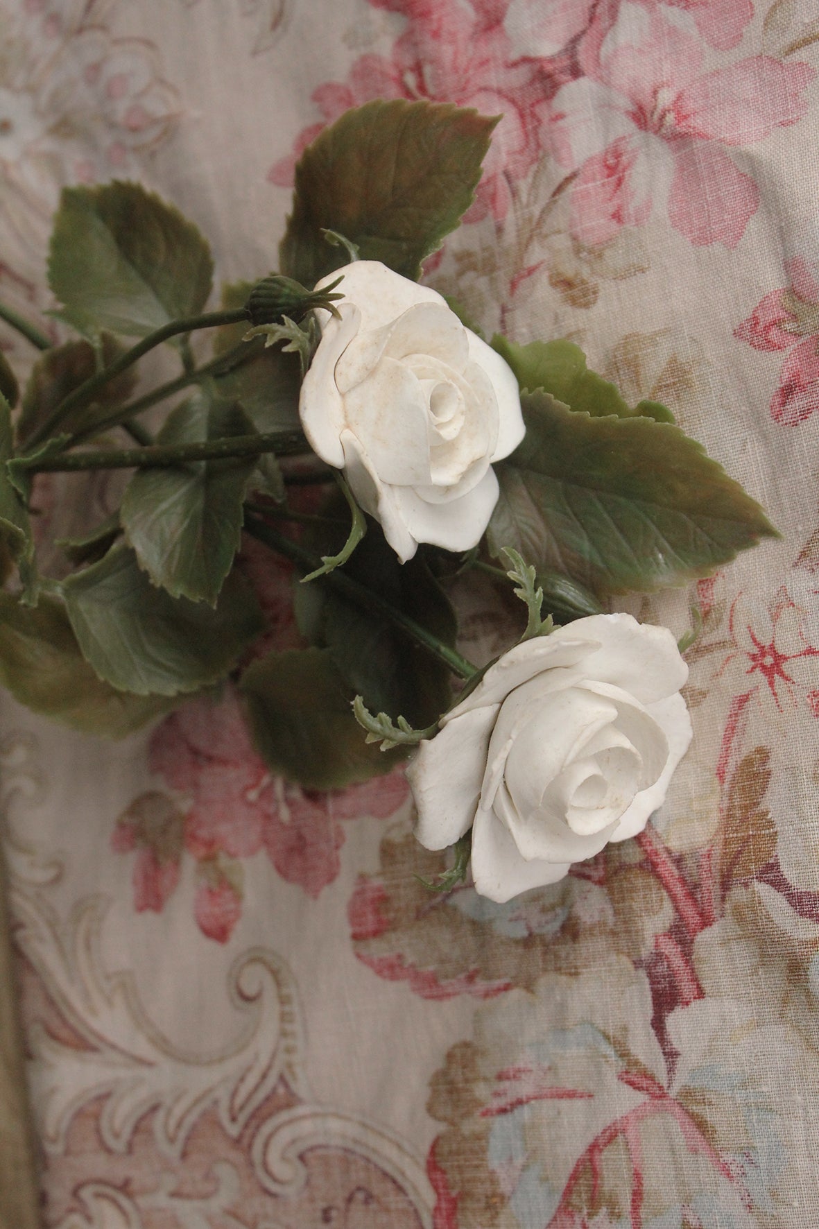 A pair of vintage roses, the flower head is made from china/pottery of sorts that has been hand made and the leaves and stem are the usual mid century plastic.