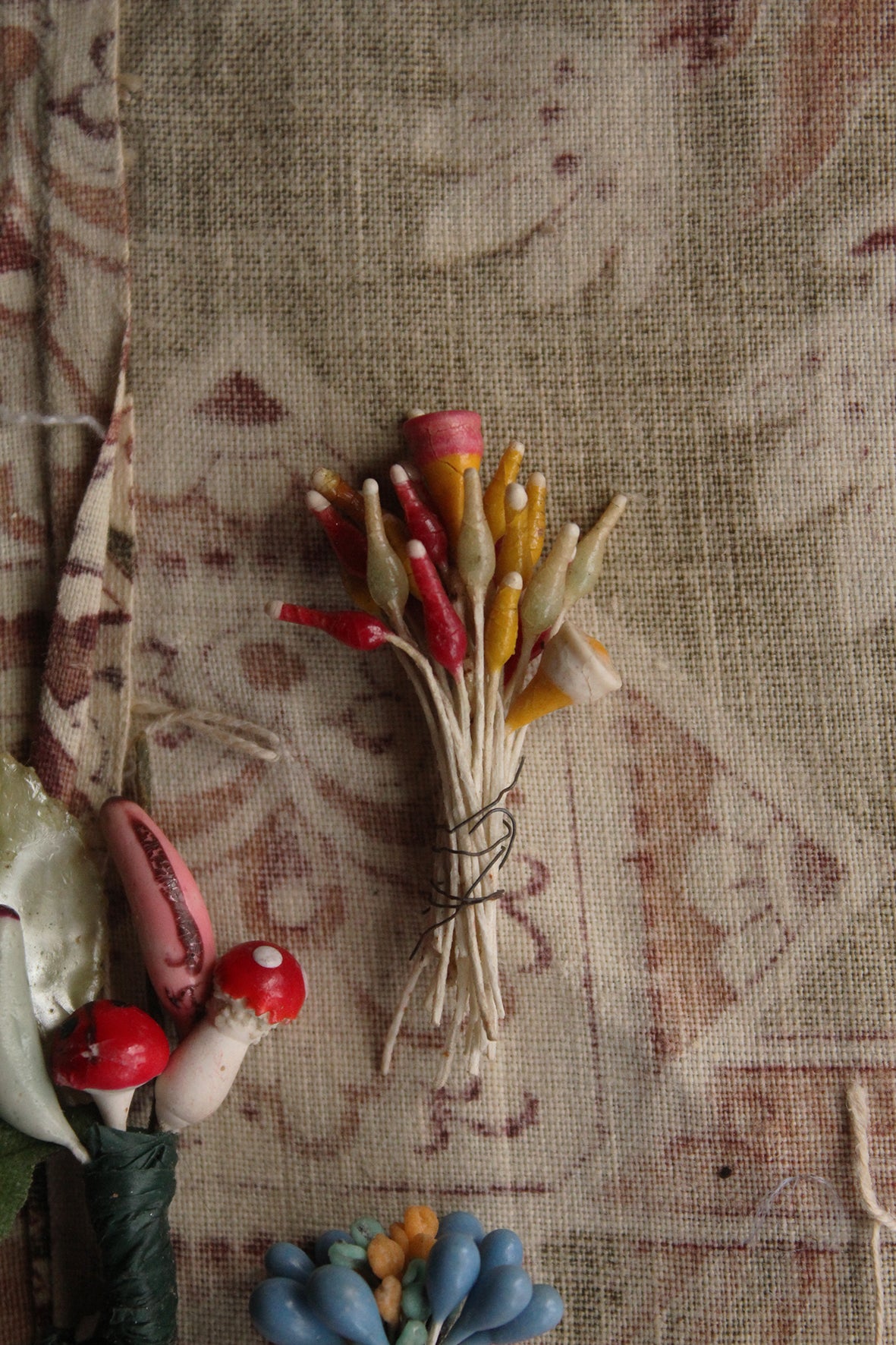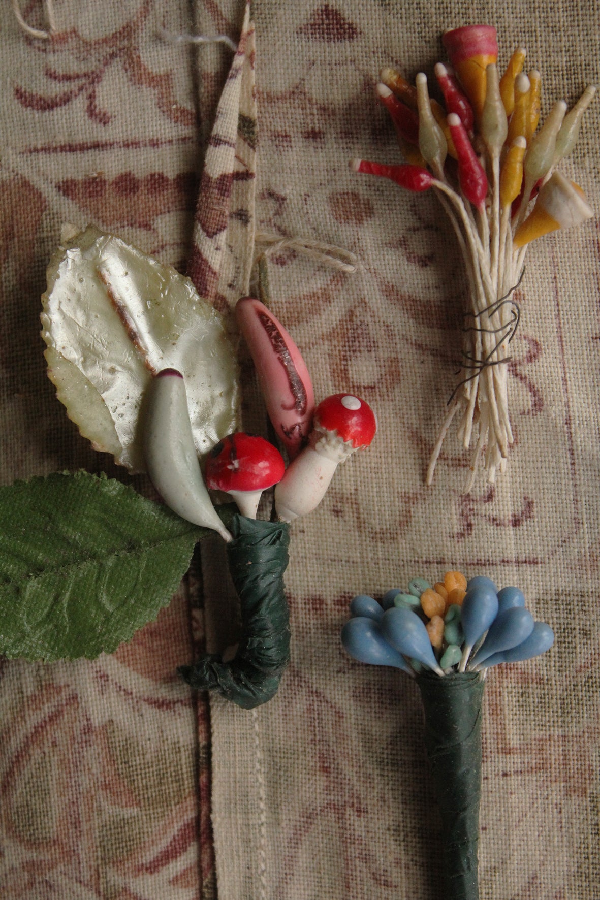 A collection of vintage flower stamen centres, lovely if making faux fabric silk flowers for millinery Delicately detailed. One includes leaves and toadstools.