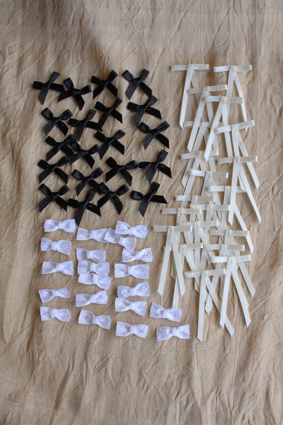 A collection of 60 miniature ribbon bows from an old haberdashery shop that closed some time ago. Perfect for journaling, slow stitching and other project work.